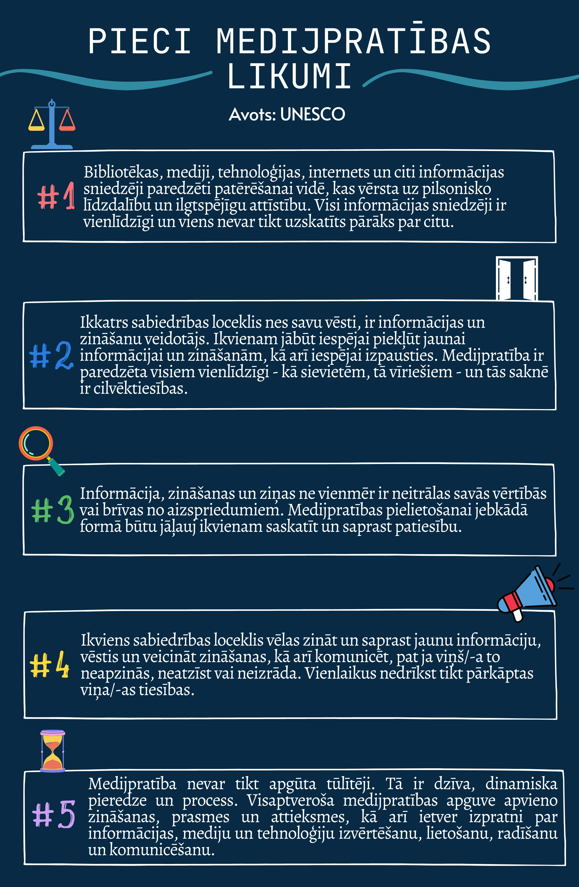Dažādos sabiedrības līmeņos arvien biežāk aktualizējoties sarunām par medijpratību, tā nereti tiek definēta kā viena no būtiskākajām 21. gadsimta prasmēm, kuru pilnveidot svarīgi ikvienam. Taču vienlaikus rodas arī virkne jautājumu, kas saistīti gan ar šī jēdziena definīciju, gan apguves iespējām. Lai palīdzētu orientēties medijpratības un informācijpratības “biezokņos”, UNESCO 2021. gadā izdevusi apjomīgu mācību materiālu tās apguvei, kurā idejas var smelties arī mācību nodarbībām bibliotēkās.