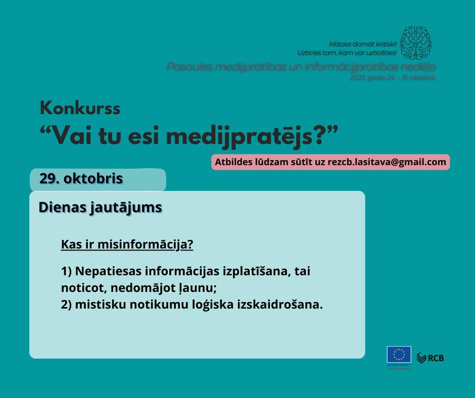 Rēzeknes Centrālā bibliotēka kopā ar “Europe Direct” Austrumlatgalē konkursu rīkoja tiešsaistē. Konkursa “Vai Tu esi medijpratējs?” gaitā katru dienu no 24. līdz 31. oktobrim bibliotēkas “Facebook” lapas sekotāji varēja iesūtīt atbildes uz dienas jautājumiem par medijpratības tēmu. Jautājumi skāra virkni apakštematu, sākot no tā, kas ir medijpratība, līdz pat sazvērestības teorijām. Jautājumi joprojām atrodami Rēzeknes Centrālā bibliotēkas “Facebook” lapā. Savukārt Maltas pagasta bibliotēka un Talsu Galvenā bibliotēka, tematisko nedēļu integrējot skolēnu brīvlaika aktivitātēs, piedāvāja medijpratības spēles bērnu auditorijai izspēlēt klātienē.