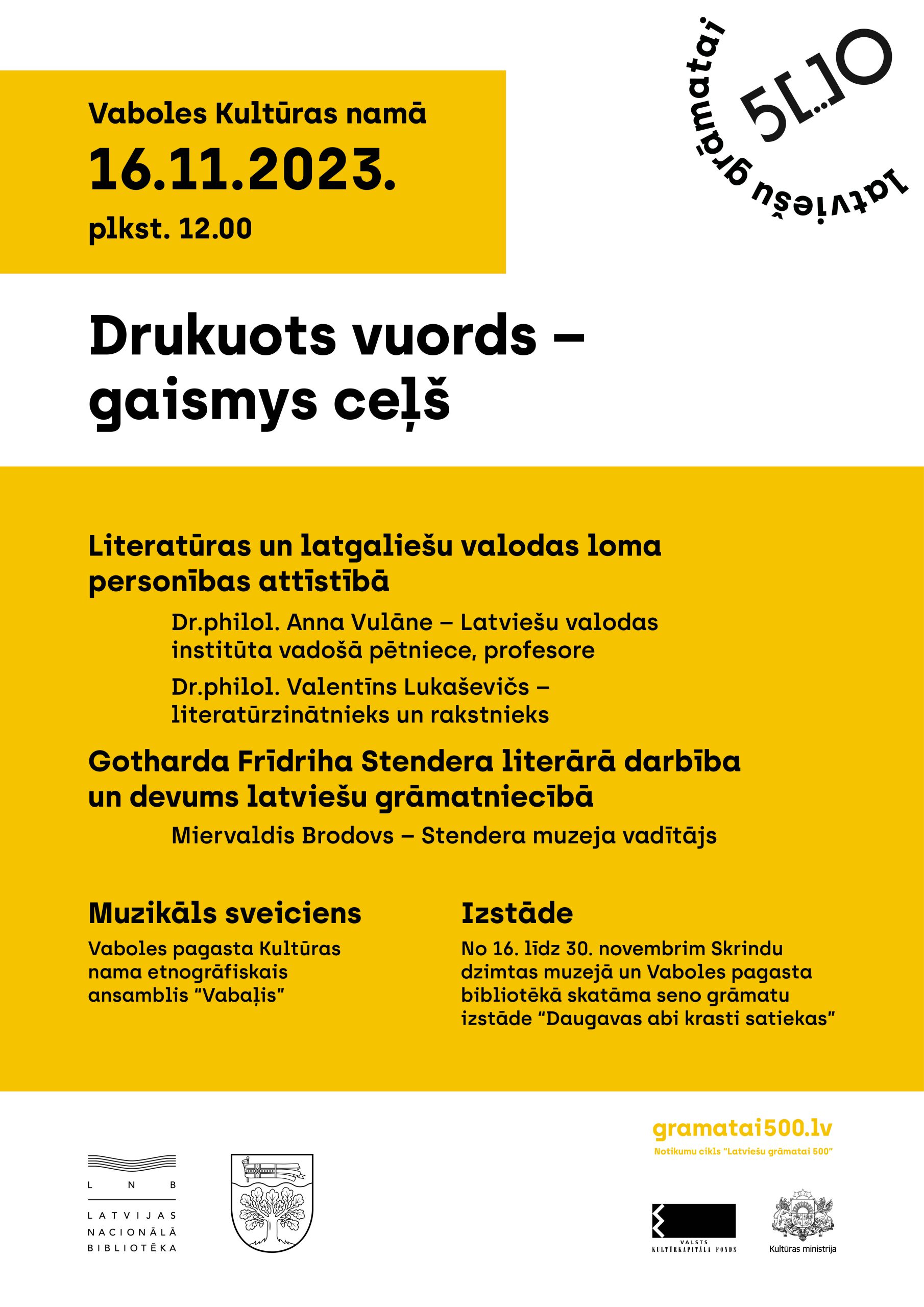 2023. gada 16. novembrī Vaboles Kultūras namā notiks izglītojošs pasākums, kurā varēs uzzināt par literatūras un latgaliešu valodas lomu personības attīstībā. Pasākums tiek rīkots Latvijas Nacionālās bibliotēkas notikumu cikla “Latviešu grāmatai 500” ietvaros.