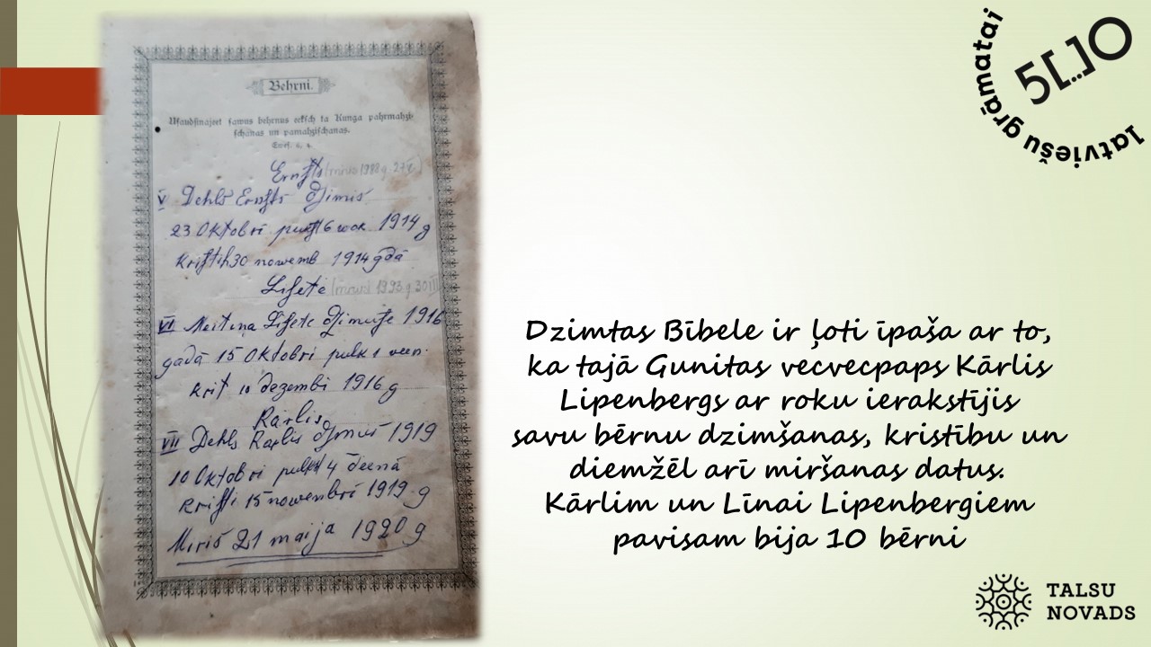 Patiesas apbrīnas vērts ir tieši šīs vienas grāmatas stāsts. Tajā ir viss – no dzimšanas līdz aiziešanai, ikdienas sūrums un mīļuma dzirksts un vēl mūsdienās atrastie spēka vārdi. Dzimtas Bībele ir ļoti īpaša ar to, ka tās pirmajās lappusēs Gunitas vecvecpaps Kārlis Lipenbergs ar roku ierakstījis savu bērnu dzimšanas, kristību un, diemžēl, arī miršanas datus. Šīs rakstītās rindiņas ir pilnas ar mīļumu, jo pie meitu vārdiem ierakstīts “meitiņa”, blakus atrodam lielas sāpes, jo glabā ierakstu, ka dēls Kārlis nodzīvojis vien 7 mēnesīšus.