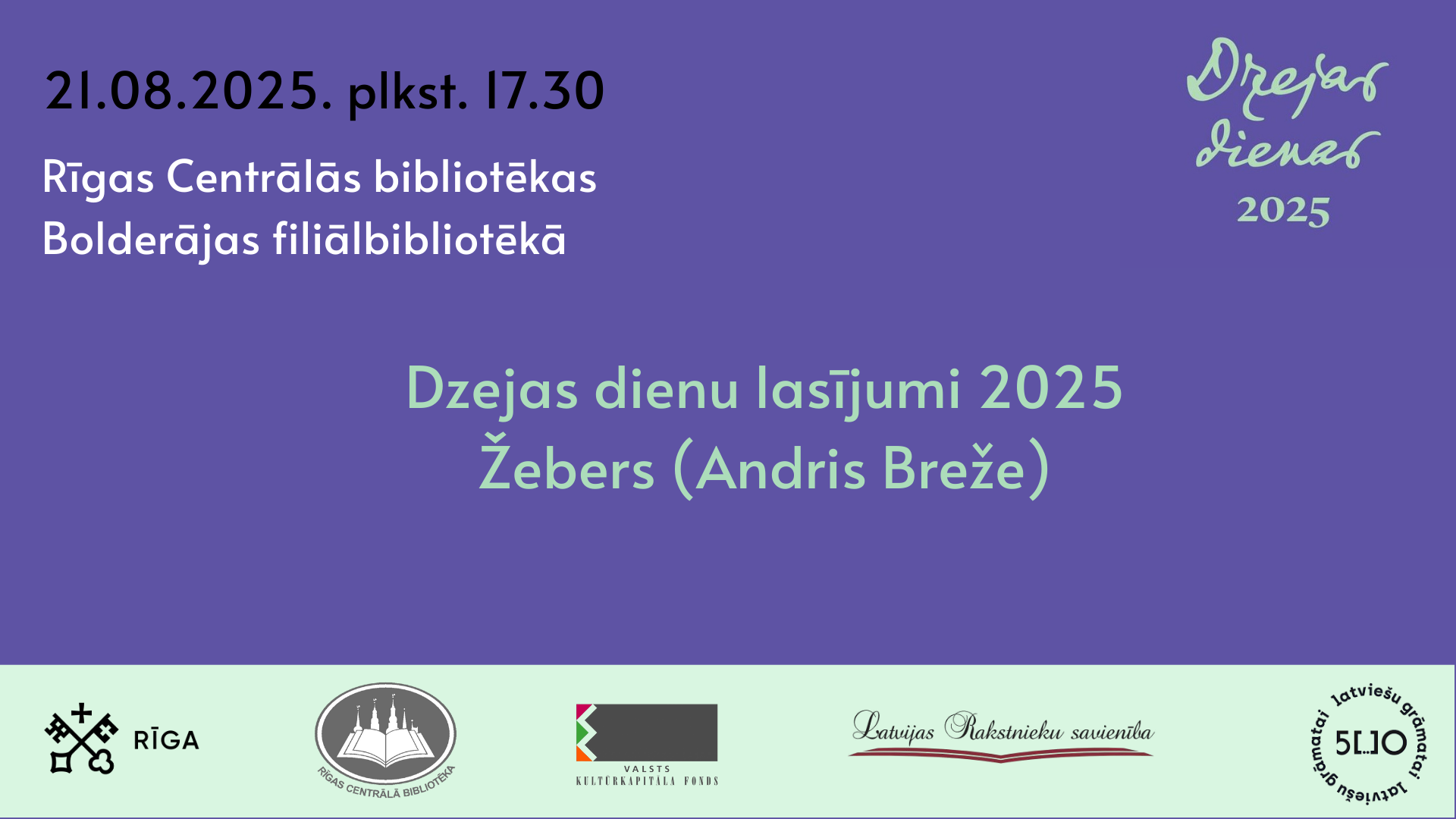 - Žebers (Andris Breže). 21.08.2025. plkst.17.30 Bolderājas filiālbibliotēkā (Gaigalas 3);