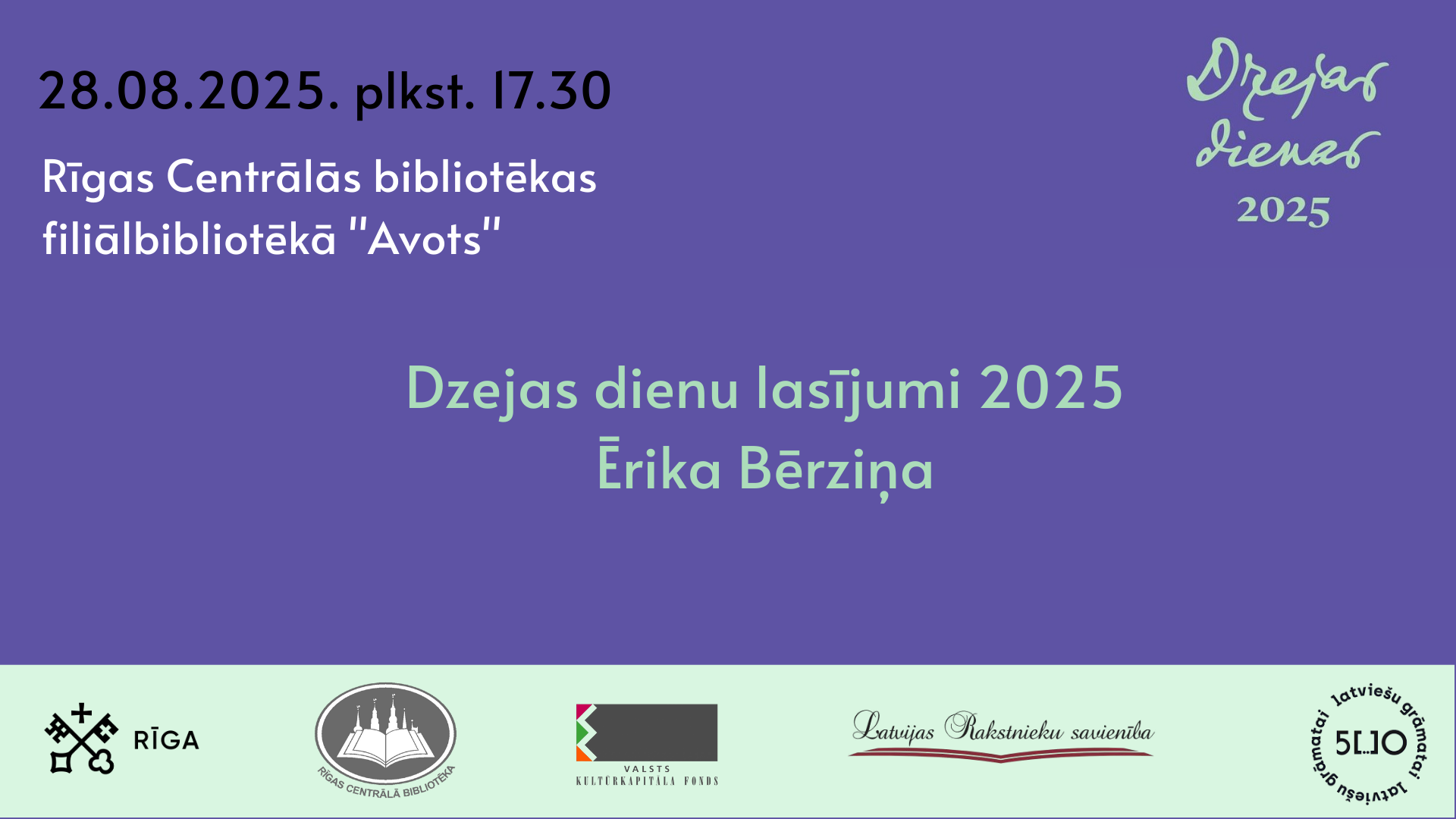28. augustā plkst. 17.30 RCB filiālbibliotēkā “Avots” (Stabu ielā 64) uz lasījumu aicinās dzejniece Ērika Bērziņa.