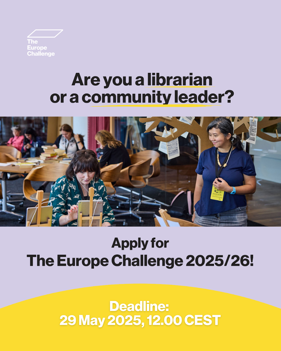 Vai jūsu bibliotēka un vietējā kopiena vēlas kopīgi risināt aktuālus sociālos, digitālos vai vides izaicinājumus? “Eiropas izaicinājums” ir ikgadēja programma, kas apvieno bibliotēkas un kopienas visā Eiropā, lai attīstītu, dalītos un īstenotu radošus risinājumus ar Eiropas Kultūras fonda un tā partneru atbalstu. Pieteikšanās “Eiropas izaicinājuma 2025/26” programmai atvērta līdz 2025. gada 29. maijam.