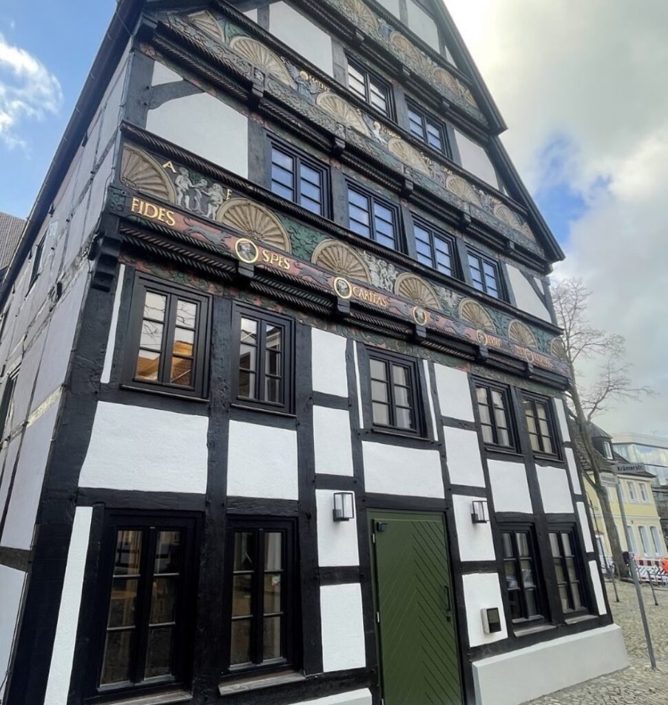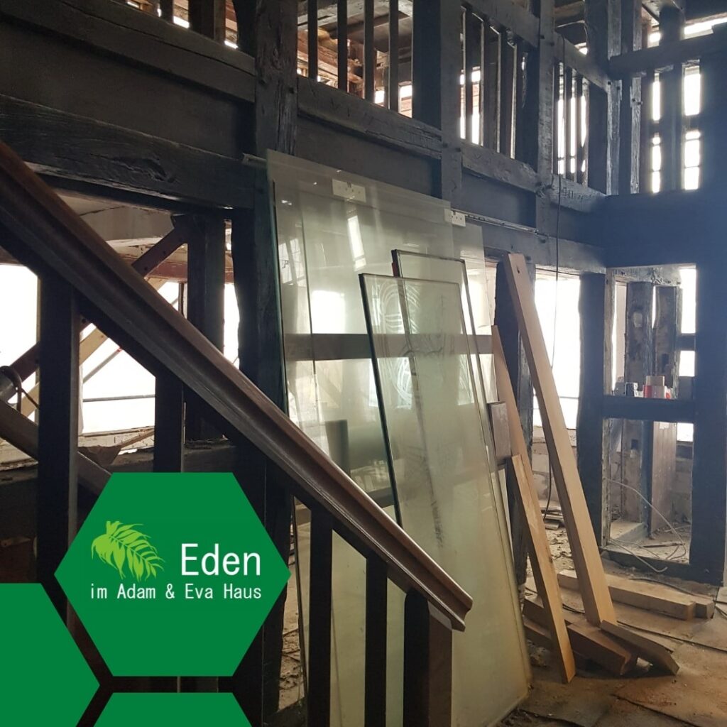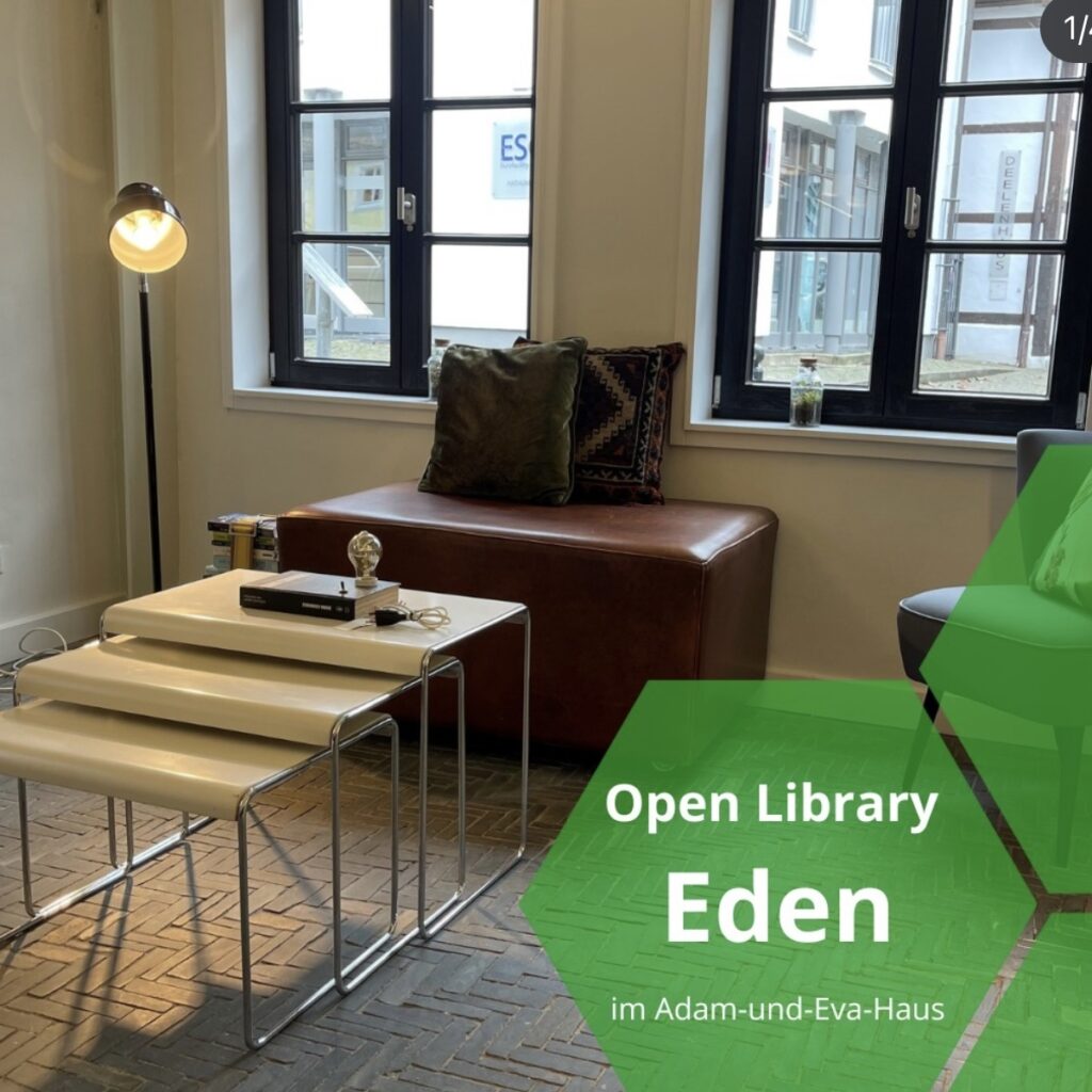 Ēka ir tā dēvētais Ādama un Ievas nams – viena no skaistākajām pusmūra ēkām Pāderbornā. Ēka celta ap 1560. gadu, un trīsstāvu pusmūra nams izceļas ar bagātīgiem koka griezumiem un rotājumiem. Savu nosaukumu tā ieguvusi no frīzes, kurā attēlota Ādama un Ievas izraidīšana no Paradīzes. Lai arī frīze vēsta par aiziešanu no Ēdenes dārza, līdz ar ilgtspējas bibliotēkas ienākšanu šajā namā, pilsētas iedzīvotāji ir ieguvuši īstenu paradīzi. No 1977. līdz 2015. gadam ēkā atradās Pāderbornas pilsētas vēstures muzejs. Šodien nams ir pārbūvēts par atvērto ilgtspējas bibliotēku un vienlaikus izmitina arī Pāderbornas pilsētas bibliotēkas administrāciju. Galvenā bibliotēkas ēka atrodas tikai trīs minūšu gājiena attālumā.