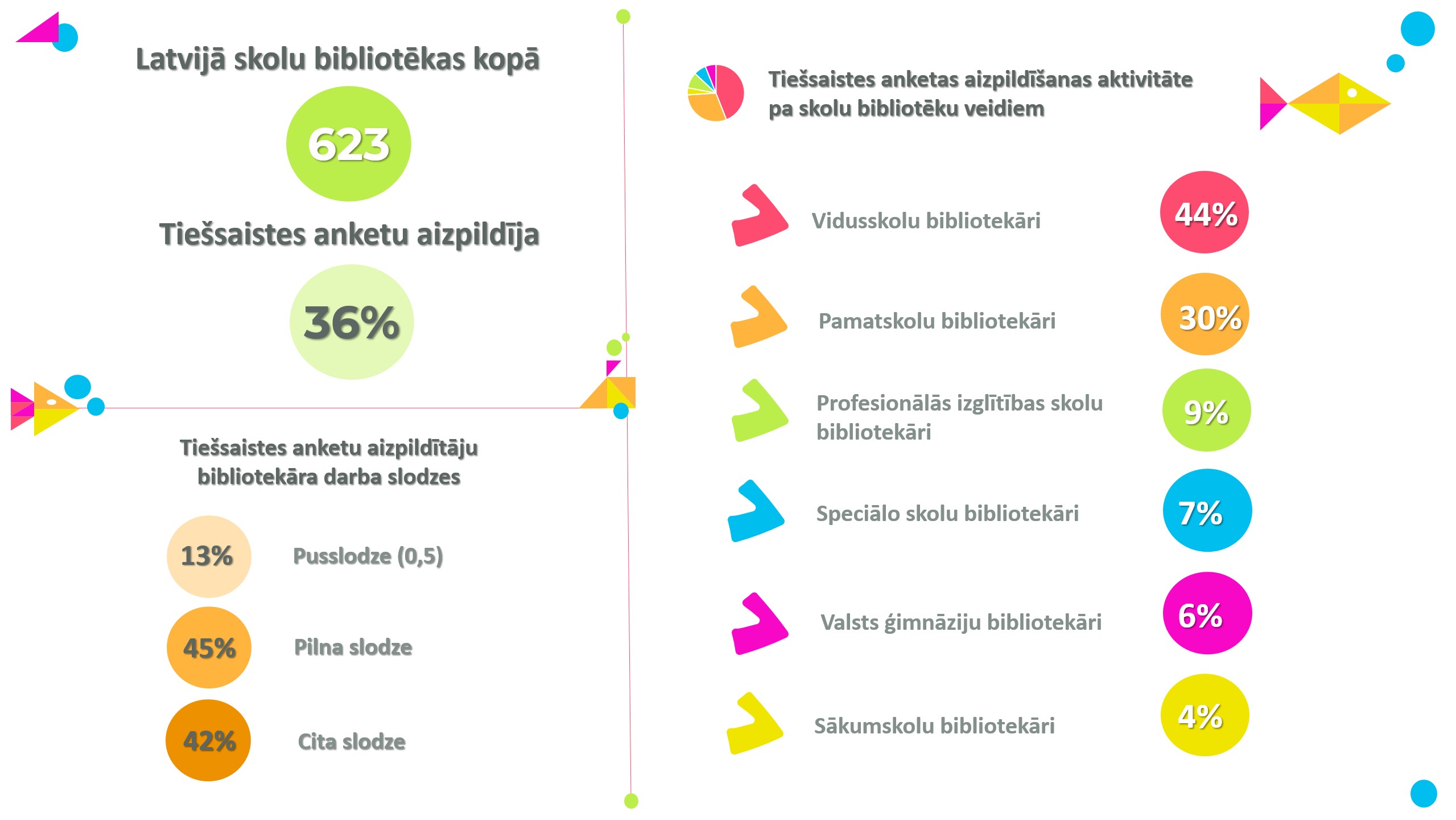 Anketas par darbu 2022. gadā aizpildīja 36 % no kopējā skolu bibliotēku skaita. 2022. gadā Latvijā bija 623 skolu bibliotēkas. Aktīvākie anketu aizpildītāji bija vidusskolu bibliotekāri, kas ir 44 % no kopējā respondentu skaita, pamatskolas bibliotekāri, kas ir 30 % no kopējā respondentu skaita, un profesionālo izglītības iestāžu bibliotekāri, kas ir 9 % no kopējā respondentu skaita.