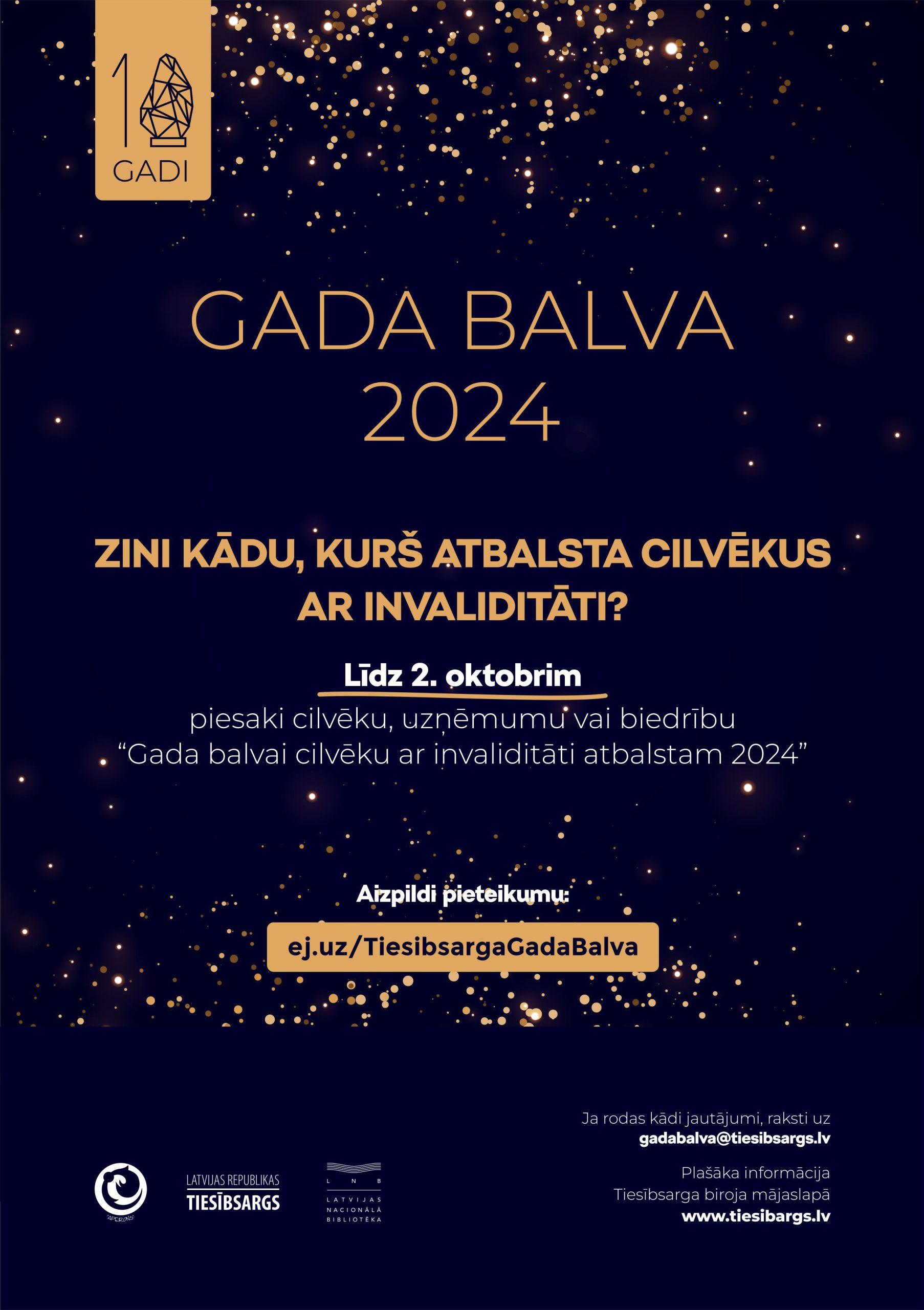 Tiesībsargs sadarbībā ar Invalīdu un viņu draugu apvienību “Apeirons” un Latvijas Nacionālo bibliotēku jau desmito gadu aicina iedzīvotājus būt vērīgiem, pamanīt un novērtēt mūsu līdzcilvēku nozīmīgo ieguldījumu, piesakot viņus konkursam “Gada balva cilvēku ar invaliditāti atbalstam 2024”. To elektroniski var izdarīt līdz 2. oktobrim. Konkursa balvu piešķir par aktivitātēm, kas ir uzsāktas vai īstenotas laika posmā no 2023. gada 1. septembra līdz 2024. gada 31. augustam.