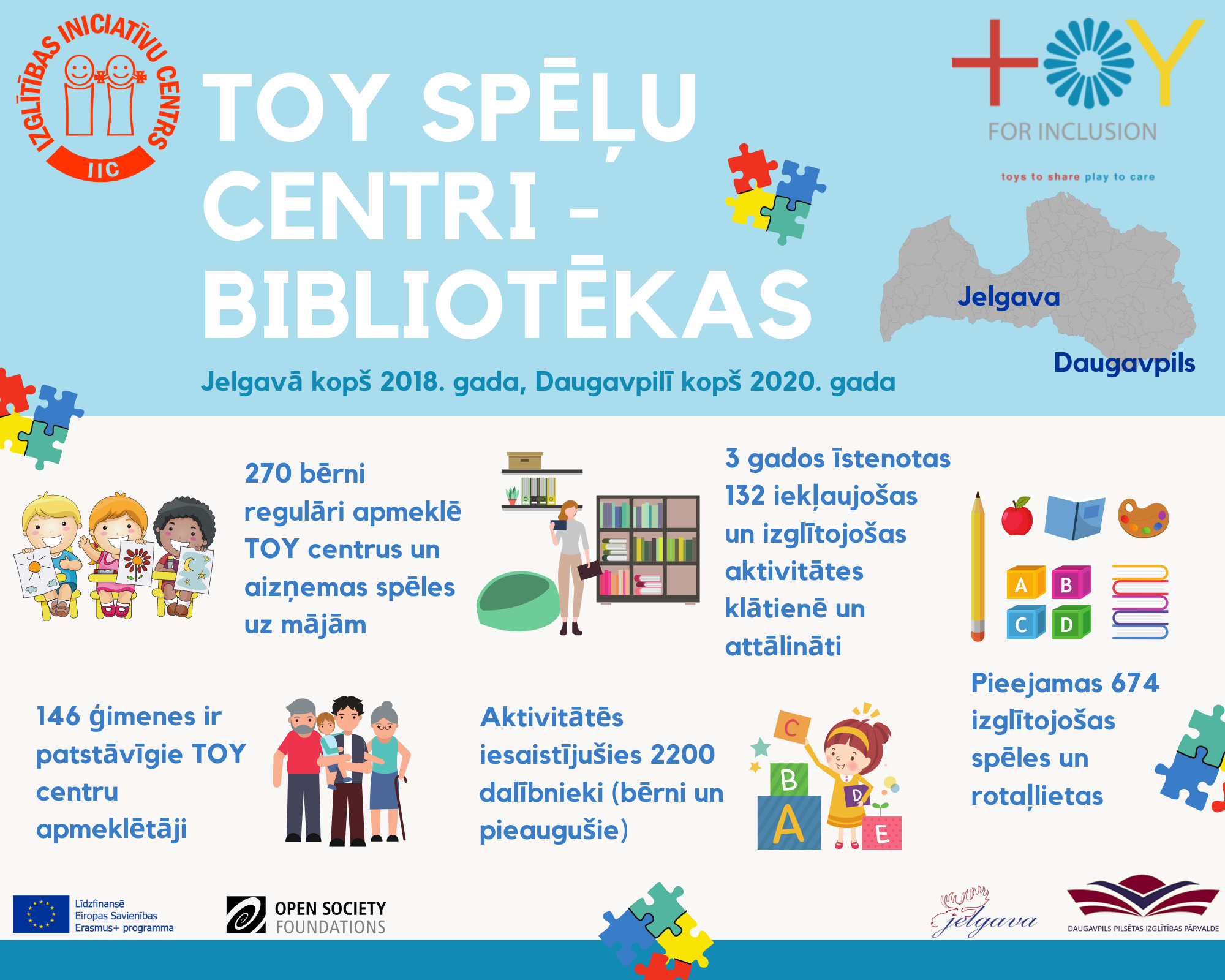 Pirmais centrs, kas tika atvērts Jelgavā 2018. gada sākumā, pievērsās sociālās iekļaušanas iespējām, veidojot jēgpilnu un savstarpējā uzticībā balstītu mijiedarbību starp maziem bērniem un viņu ģimenēm no dažādām etniskām grupām, skaitā vietējiem romu tautības bērniem. Rotaļlietu bibliotēka ir droša vide, kur veidot šo sadarbību un mijiedarbību. Bibliotēka ir atvērta jebkuram bērnam un viņa ģimenes locekļiem, turklāt pieejams pilnīgi bez maksas.