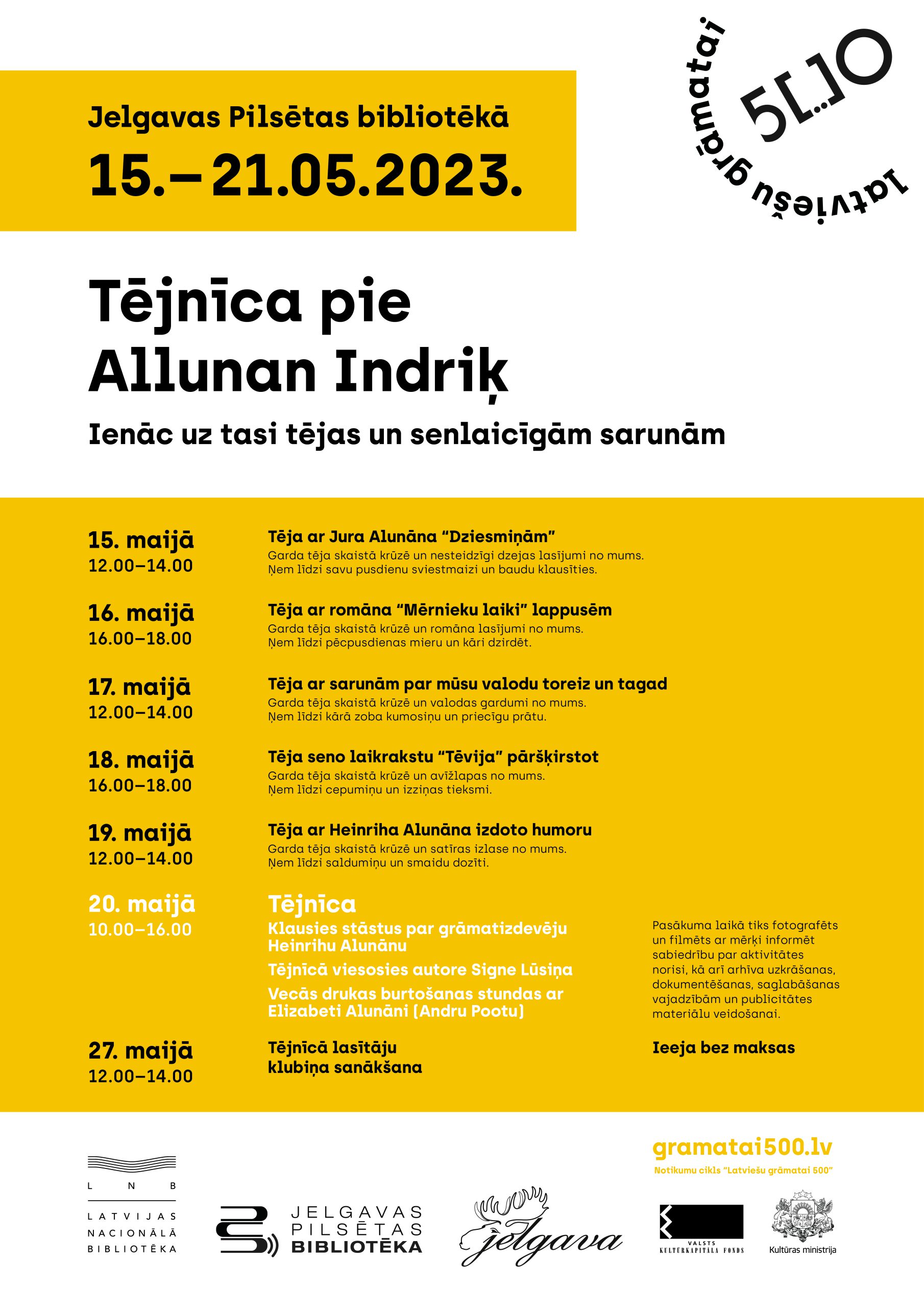 “Tējnīca pie Allunan Indriķ” apmeklētājiem būs atvērta jau no 15. līdz 20. maijam, kad visas nedēļas garumā, aicinām ikvienu bibliotēkas un pilsētas viesi paciemoties Jelgavas bibliotēkā un izjust īpašu svētku noskaņu, kā arī 27. maijā lasītāju klubiņa saietam pilsētas svētku gaisotnē.