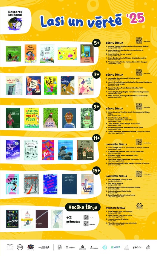 Viens no sabiedrības iesaistes kustības “Restarts lasīšanai” centrālajiem notikumiem ir Latvijas Nacionālās bibliotēkas (LNB) lasīšanas veicināšanas programma “Bērnu, jauniešu un vecāku žūrija 2025”, kas ar lielu aktivitāti notiek jau 25. gadu. Izsludinām bibliotēku, skolu, diasporas centru un arī individuālu interesentu pieteikšanos lielākajai un senākajai valsts finansētai lasītveicināšanas iniciatīvai.