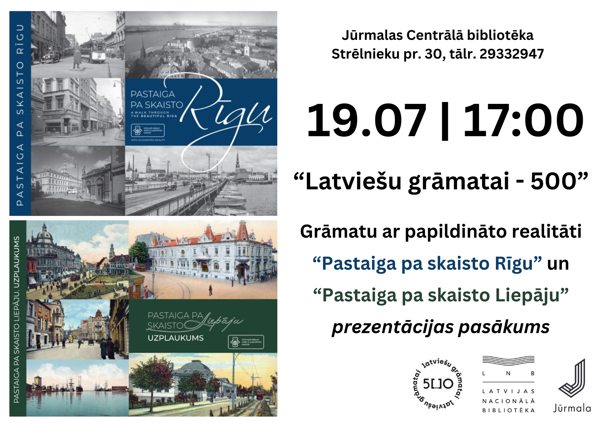 19. jūlijā plkst. 17.00 Jūrmalas Centrālajā bibliotēkā, Strēlnieku prospektā 30, Jūrmalā, norisināsies Latvijā pirmo grāmatu ar papildināto realitāti “Pastaiga pa skaisto Rīgu” (2024) un “Pastaiga pa skaisto Liepāju: uzplaukums” (2023) prezentācijas pasākums.