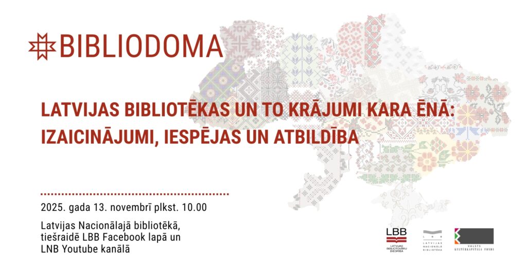 2025. gada 13. novembrī no plkst. 10.00 līdz 16.00 norisināsies seminārs un diskusija “Bibliodoma. Latvijas bibliotēkas un to krājumi kara ēnā: izaicinājumi, iespējas un atbildība”. Seminārs notiks klātienē Latvijas Nacionālās bibliotēkas Bibliotēkzinātnes lasītavā, kā arī tiešraidē Latvijas Bibliotekāru biedrības (LBB) Facebook lapā un Latvijas Nacionālās bibliotēkas Youtube kanālā.