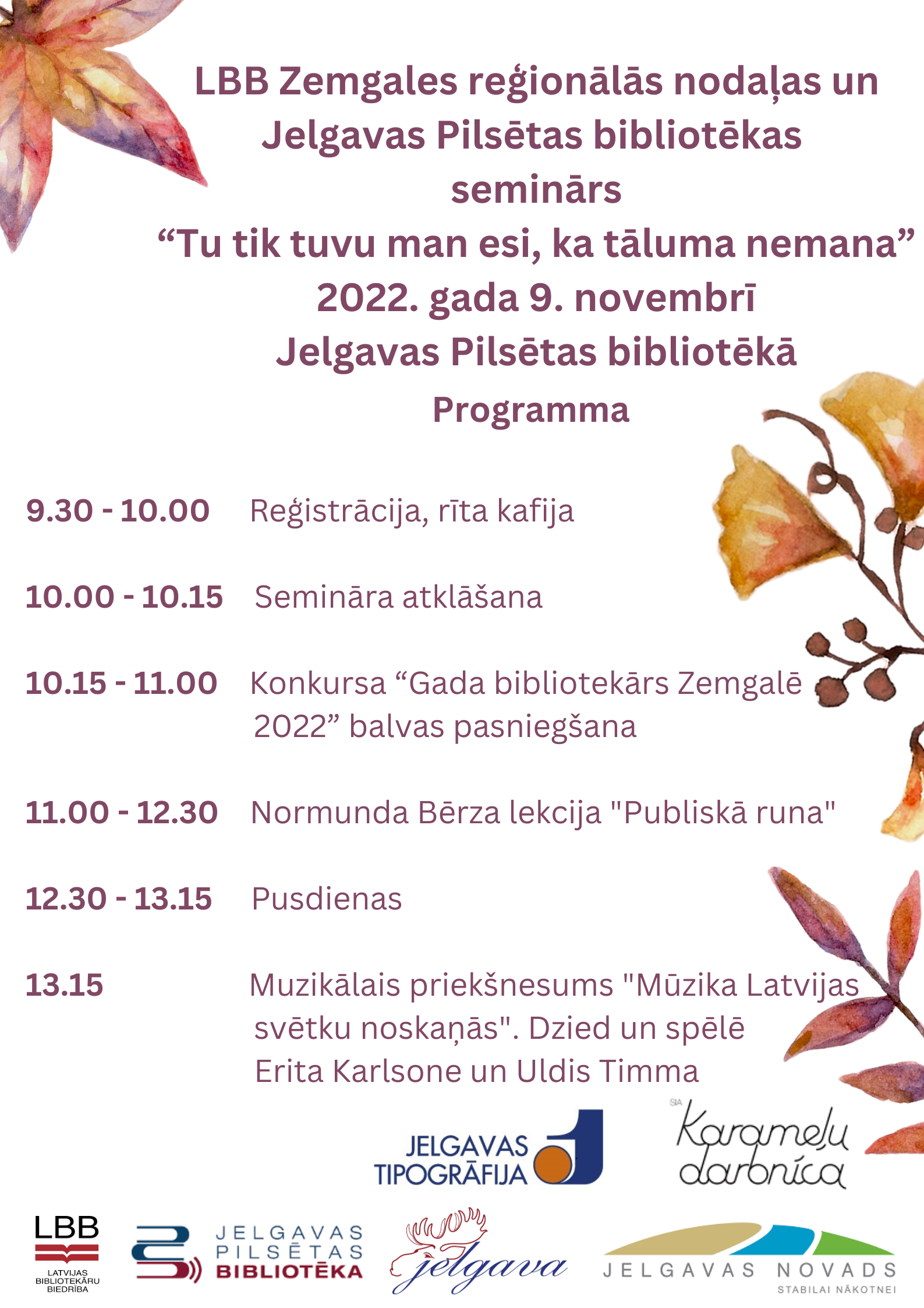 2022. gada 9. novembrī Latvijas Bibliotekāru biedrības (LBB) Zemgales nodaļa un Jelgavas pilsētas bibliotēka ar Valsts kultūrkapitāla fonda un Jelgavas valstspilsētas pašvaldības atbalstu rīko ikgadējo reģionālo bibliotekāru semināru. Uz pasākumu aicināti Zemgales reģiona bibliotekāri.