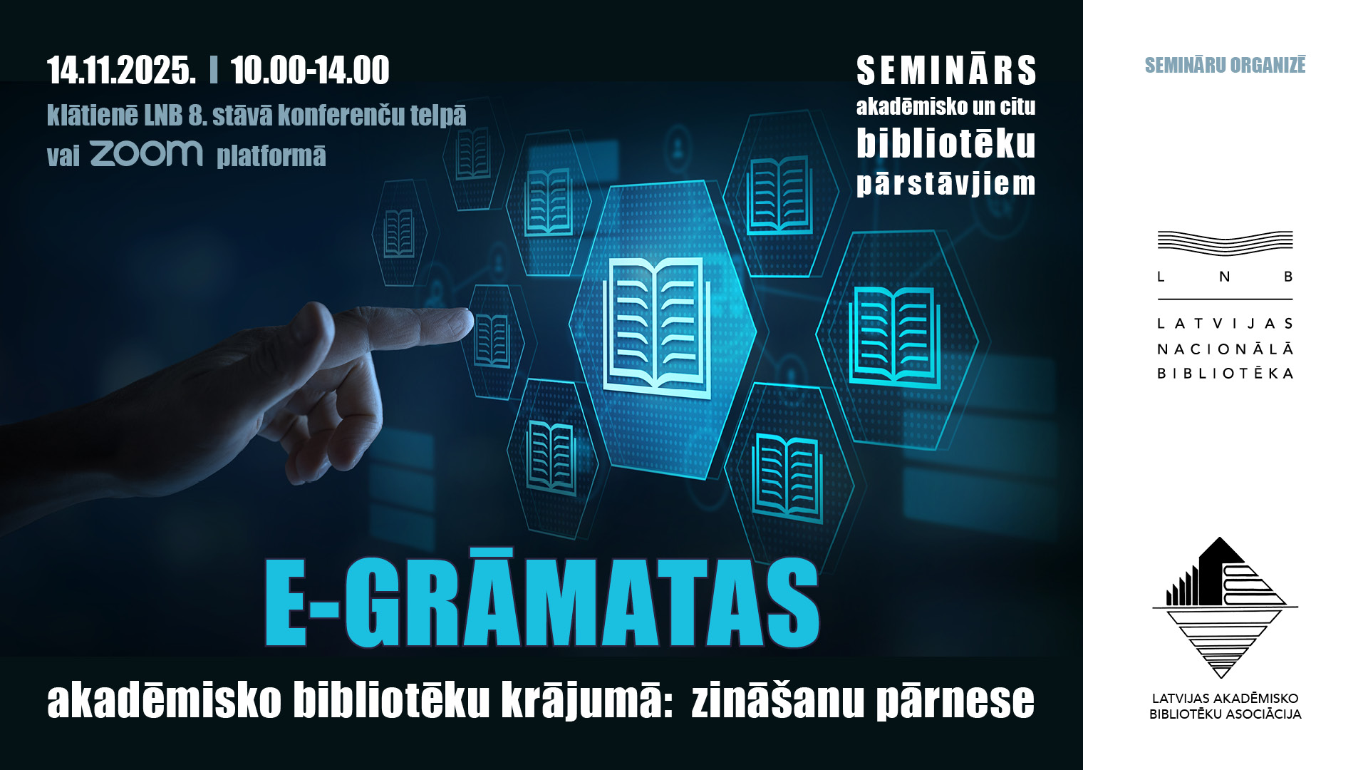 Latvijas Akadēmisko bibliotēku asociācija un Latvijas Nacionālā bibliotēka aicina piedalīties seminārā “E-grāmatas akadēmisko bibliotēku krājumā: zināšanu pārnese” šī gada 14. novembrī, klātienē LNB 8. stāvā konferenču telpā Mūkusalas ielā 3 vai Zoom platformā no plkst.10.00-14.10.