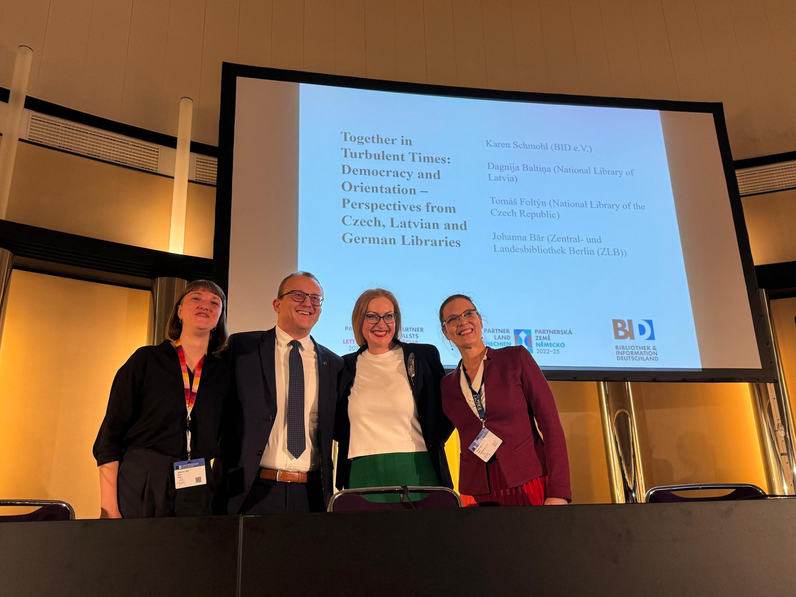 Dienas noslēgumā LNB direktore Dagnija Baltiņa piedalījās Vācijas–Čehijas–Latvijas paneļdiskusijā “Kopā nemierīgos laikos: demokrātija un virzība – viedokļi no Čehijas, Latvijas un Vācijas bibliotēkām”, ar kuru arī oficiāli tika nodota Čehijas kā 2022.–2025. gada partnervalsts stafete. Diskusija bija gana spraiga un aktualizēja jautājumus par budžeta samazināšanu un tā ietekmi uz bibliotēku sniegtajiem pakalpojumiem, bibliotēku neitralitāti un to lomu sabiedrības informācijpratības veicināšanā.