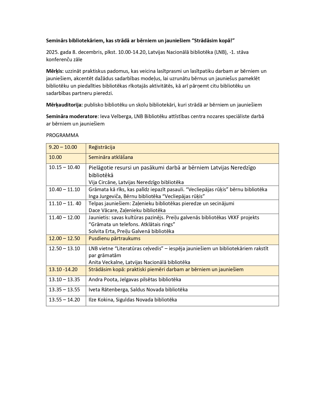 Latvijas Nacionālās bibliotēkas Bibliotēku attīstības centrs aicina uz semināru bibliotekāriem, kas strādā ar bērniem un jauniešiem, “Strādāsim kopā”. Seminārs notiks 2025. gada 8. decembrī no plkst. 10.00 līdz 14.40 Latvijas Nacionālās bibliotēkas -1. stāva konferenču zālē.