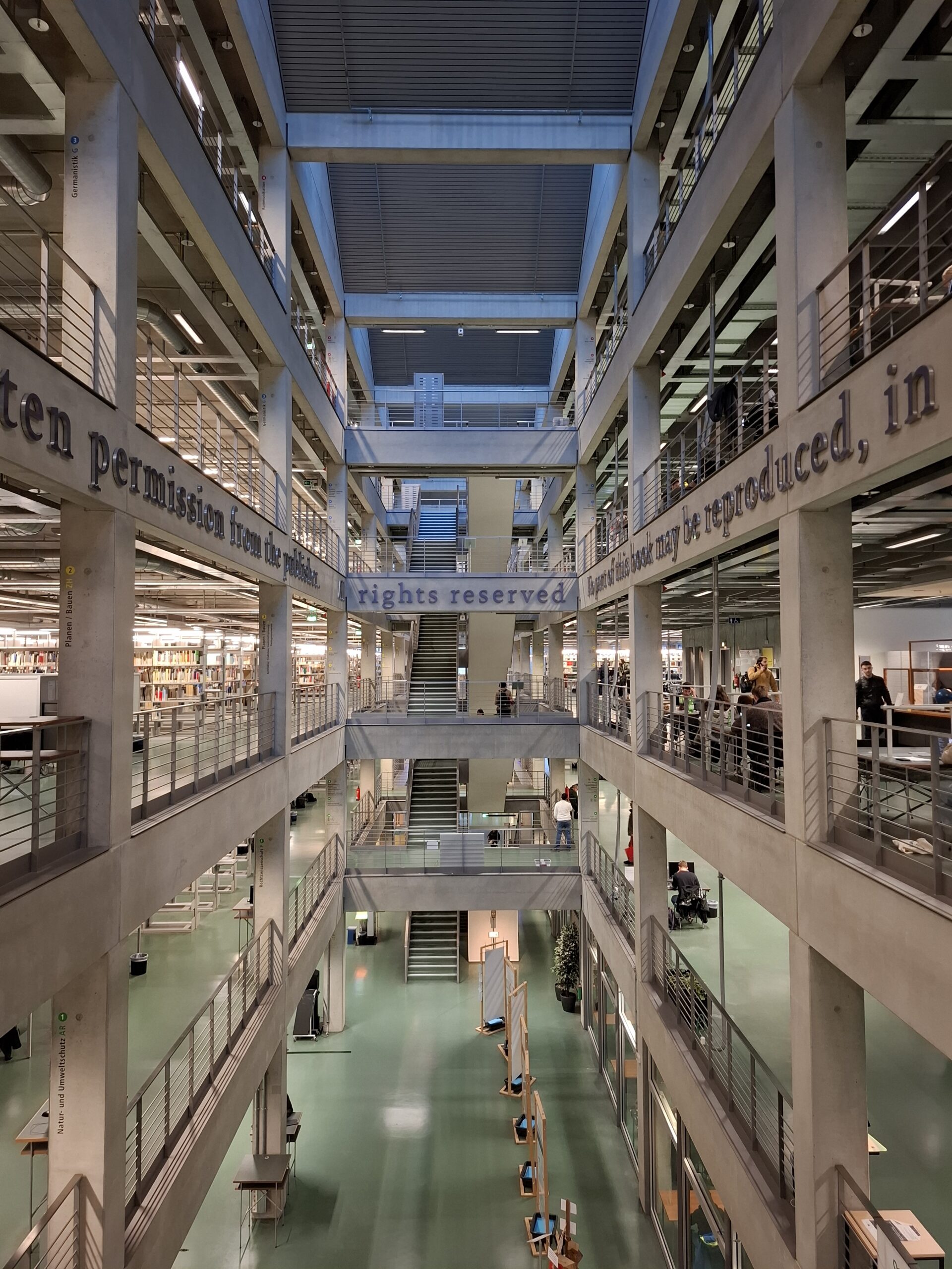 Centrālā bibliotēkas ēka ir atvērta 24/7, ar dažiem nosacījumiem piekļuvei naktī un brīvdienās. Tas ir izmēģinājuma projekts, kura rezultāti tiks vērtēti no dažādiem aspektiem. Atsevišķas bibliotēkas daļas, piemēram, atvērtie periodikas plaukti pazemes stāvā, ir pieejamas tikai pamatdarba laikā. Bibliotēka piedāvā elektroniskos resursus, e-grāmatas, zinātniskus rakstus un datubāzes, kā arī iespēju pasūtīt literatūru, izmantot starpbibliotēku abonementu un pieteikties konsultācijām par informācijas meklēšanu. Bibliotēka neorganizē izstādes un pasākumus, kas nav saistīti ar lasītāju mācībām. Telpās ir vairāki bezmaksas skenēšanas punkti. Bibliotēkā tiek ievērots klusums, tomēr ir vairākas atsevišķas telpas grupu darbam, kuras bieži tiek izmantotas. Gaiteņos ir izvietoti kartona pulksteņu diski, līdzīgi automašīnu stāvlaukumu diskam, kurus var uzlikt, ja individuālā vai grupu darba telpu atstāj uz laiku līdz 60 min. Apmeklētājiem ir pieejami arī dažādi palīglīdzekļi, piemēram, galda lampas un portatīvo datoru statīvi, kā arī ir iespēja iegādāties krāsainos ausu aizbāžņus. Bibliotēkā ir īpašas telpas studējošiem vecākiem ar bērniem, atpūtas zonas ar puzlēm, telpaugiem un plakanu virsmu, kur var īslaicīgi apgulties. Bibliotēkā ir noskaņojuma siena, kur bieži tiek atstāti Palestīnas atbalsta saukļi, atsevišķa atsauksmju siena, kā arī vizuāli pārskatāma statistika / aptauju rezultāti, kas balstīti uz iepriekšējā gada lietotāju atsauksmēm. Grāmatu izsniegšanai un nodošanai tiek izmantota pašapkalpošanās iekārta, kurā iespējams arī apmaksāt kavējuma naudu ar bankas maksājumu karti.