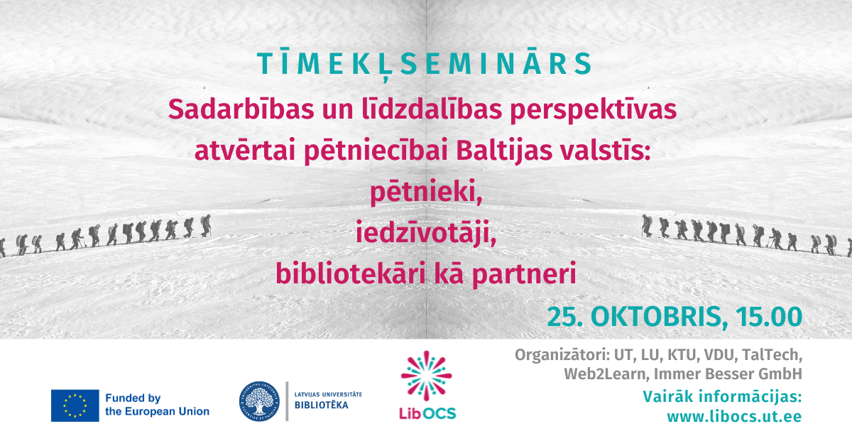 Tīmekļseminārs “Sadarbības un līdzdalības perspektīvas atvērtai pētniecībai Baltijas valstīs: pētnieki, iedzīvotāji, bibliotekāri kā partneri” (Collaboration and participation perspectives for open research in the Baltics: researchers, citizens, librarians as partners) notiks ikgadējās starptautiskās atvērtās piekļuves nedēļas laikā, un to organizē Latvijas Universitātes Bibliotēka sadarbībā ar partnerorganizācijām projekta LibOCS ietvaros.