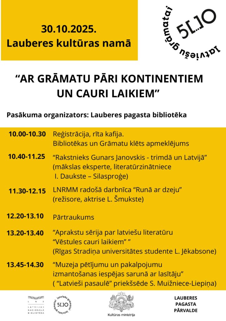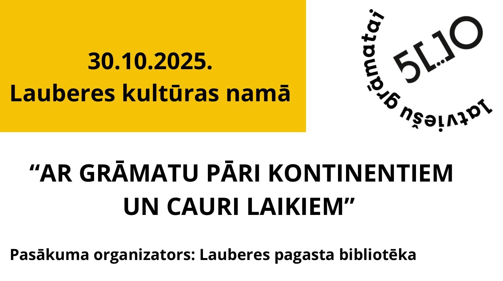 2025. gada 30. oktobrī Ogres novada Lauberes pagasta bibliotēkā notiks pasākums “Ar grāmatu pāri kontinentiem un cauri laikiem”, kas tiek rīkots ar Latvijas Nacionālās bibliotēkas programmas “Latviešu grāmatai 500” un LR Kultūras ministrijas atbalstu.