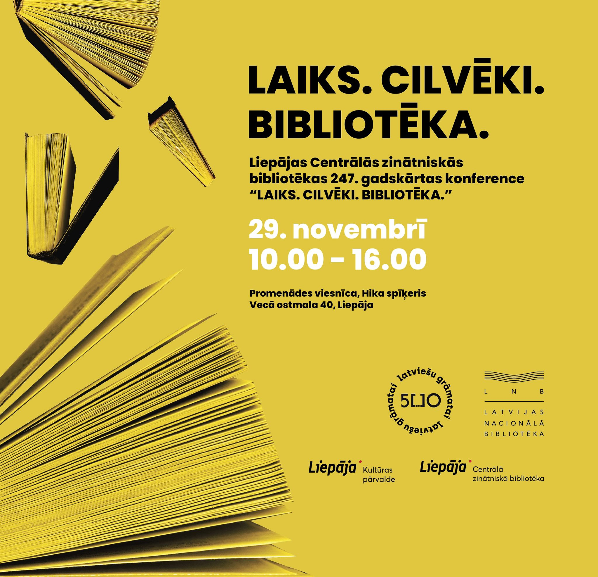 Liepājas Centrālā zinātniskā bibliotēka 2024. gada 29. novembrī organizē 247. gadskārtas konferenci “LAIKS. CILVĒKI. BIBLIOTĒKA.”, kurā pulcēsies bibliotēku nozares speciālisti un entuziasti no visas Latvijas. Konference vienos gan Kurzemes, gan visas valsts bibliotēku darbiniekus, grāmatu draugus un kultūras atbalstītājus kopīgās sarunās un pieredzes apmaiņā.