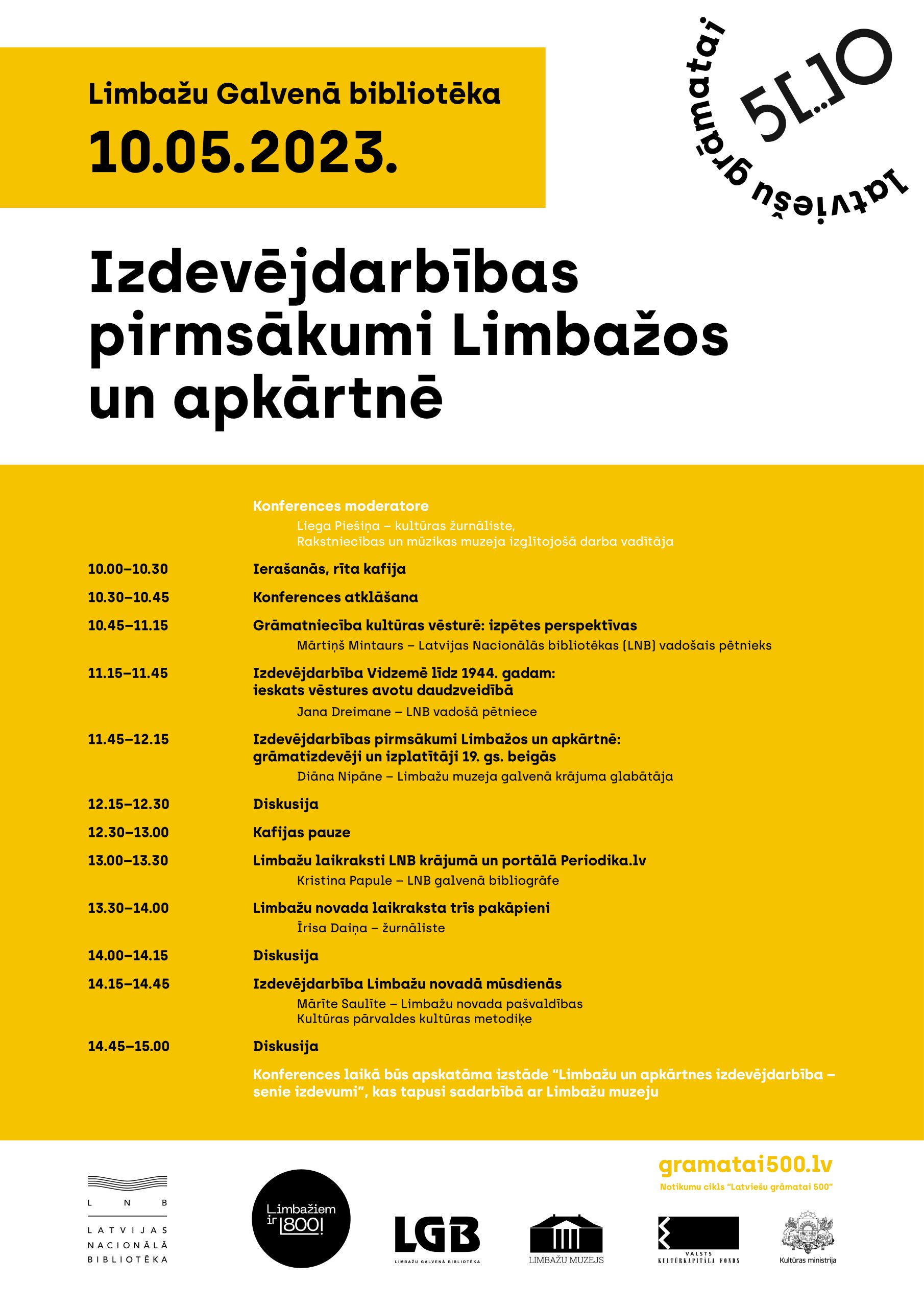 Konferences laikā notiks 6 priekšlasījumi par grāmatniecības un izdevējdarbības vēsturi. Latvijas Nacionālās bibliotēkas (LNB) vadošais pētnieks Mārtiņš Mintaurs iepazīstinās ar grāmatniecību kultūras vēsturē. LNB vadošā pētniece Jana Dreimane sniegs ieskatu vēstures avotu daudzveidībā par izdevējdarbību Vidzemē līdz 1944. gadam. Savukārt par izdevējdarbības pirmsākumiem – grāmatizdevējiem un izplatītājiem – 19. gs. beigās Limbažos un apkārtnē stāstīs Limbažu muzeja galvenā krājuma glabātāja Diāna Nipāne. Par Limbažu laikrakstiem LNB krājumā un portālā Periodika.lv stāstīs LNB galvenā bibliogrāfe Kristina Papule. Žurnāliste Īrisa Daiņa iepazīstinās ar Limbažu novada laikrakstu vēsturi “Limbažu novada laikraksta trīs pakāpieni”. Konferences noslēgumā Limbažu novada pašvaldības Kultūras pārvaldes kultūras metodiķe Mārīte Saulīte stāstīs par izdevējdarbību Limbažu novadā mūsdienās.