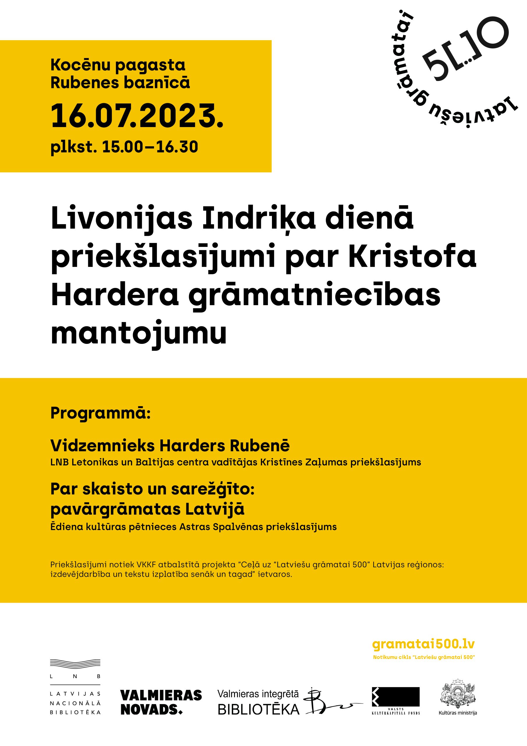 Livonijas Indriķa dienas ietvaros Kocēnu pagasta Rubenes baznīcā no plkst. 15.00–16.30 izskanēs divi priekšlasījumi: LNB Letonikas un Baltijas centra vadītājas Kristīnes Zaļumas priekšlasījums “Vidzemnieks Harders Rubenē”, kurā izgaismosies grāmatniecības atspulgi Vidzemes lauku gaisotnē 18. gadsimta beigās un tiks izceltas tā laika Rubenes personības, ievērojamākā no kurām, neapšaubāmi, bijis Rubenes draudzes luterāņu mācītājs Kristofs Harders, nereti dēvēts arī par “Vidzemes Stenderu”.
