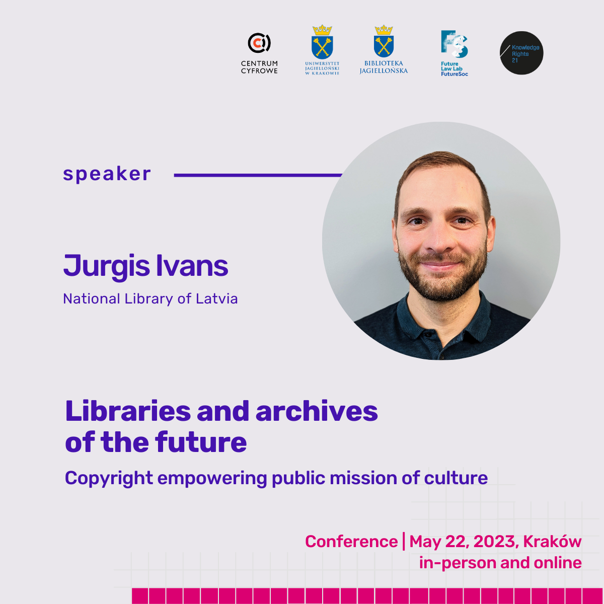 Konferencē “Nākotnes bibliotēkas un arhīvi” (Libraries and archives of the future: Copyright empowering public mission of culture) tiks aktualizēti jautājumi par bibliotēku un arhīvu rītdienu, kur tiešsaistes klātbūtne tikai pastiprināsies. Lai atmiņu institūcijas pilnībā izmantotu savu potenciālu digitālajā pasaulē, ir vispirms jārod atbildes uz vairākiem ar autortiesībām saistītiem jautājumiem. Vai ir nepieciešamas izmaiņas un kādas? Kas visvairāk nepieciešams bibliotēku un arhīvu lietotājiem?