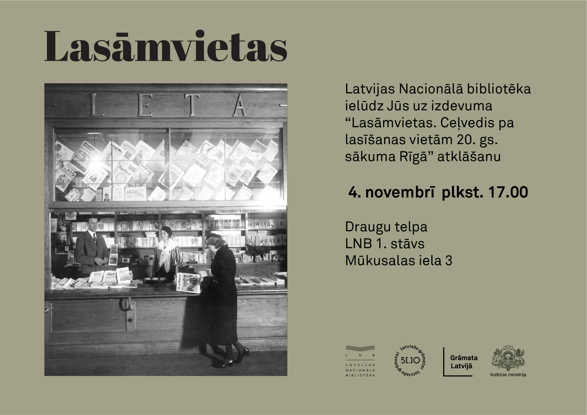 Savukārt 5. novembrī plkst. 11.00 LNB aicina piedalīties ekskursijā pilsētvidē un uzzināt par lasīšanas nozīmi cilvēka ikdienā pirms simts gadiem un šodien. Pastaigas ietvaros varēs aplūkot vietas, kas saistītas ar latviešu grāmatniecības vēsturi, tostarp dažas no ceļvedī “Lasāmvietas” pieminētajām ēkām. Galvenais varonis šajā pastaigā – drukāts vārds latviešu valodā 20. gadsimta pirmajā pusē. Ekskursijas dalībnieki būs aicināti gan dalīties savā pieredzē, gan iesaistīties lasīšanā. Ekskursiju vadīs muzejpedagoģe un viena no “Lasāmvietu” ceļveža satura autorēm Anita Smeltere. Tikšanās ekskursijai pie Stacijas laukuma pulksteņa. Pastaigas garums aptuveni 1 stunda un 30 minūtes. Noslēgums pie Laimas pulksteņa. Ekskursijas mērķauditorija: nesteidzīgi pieaugušie. Ekskursija ir bez maksas, bet tai nepieciešams iepriekš pieteikties ŠEIT. Dalībnieku skaits ierobežots.