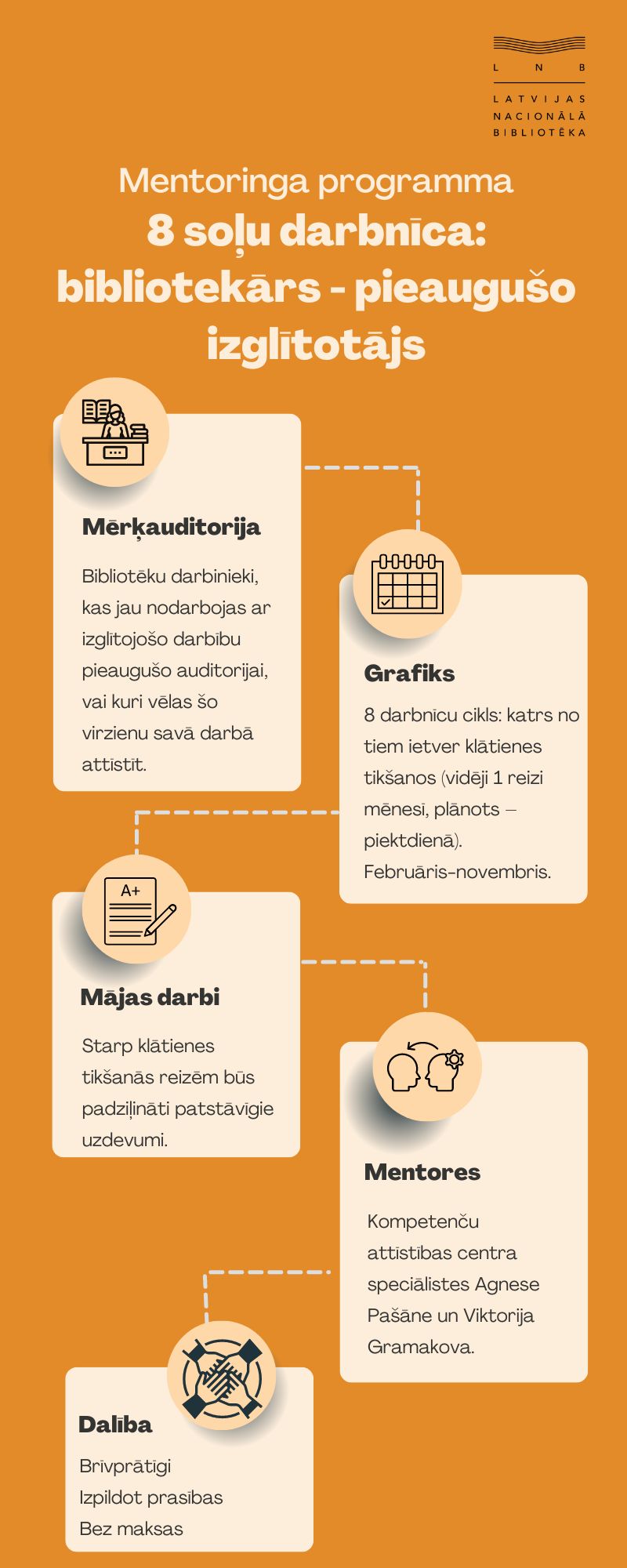 Programmas mērķauditorija: bibliotēku darbinieki, kas jau nodarbojas ar izglītojošo darbību pieaugušo auditorijai, vai kuri vēlas šo virzienu savā darbā attīstīt.