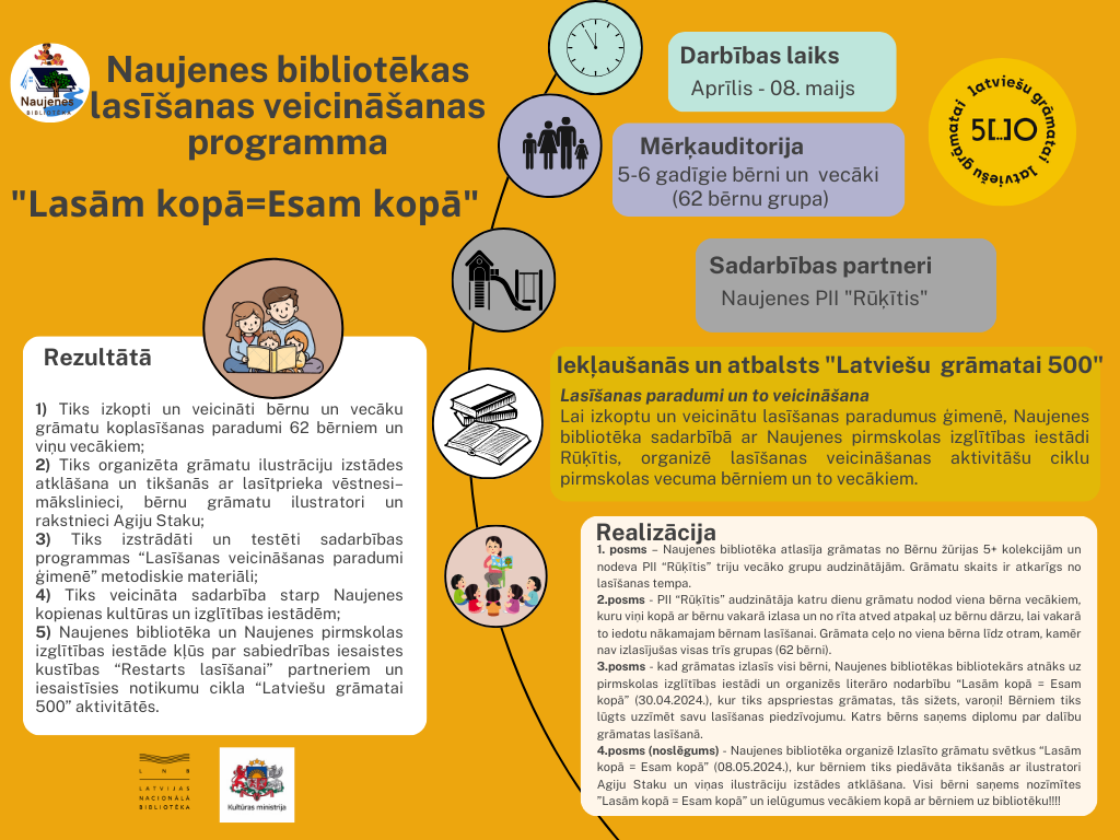 30. aprīlī, kad grāmatas izlasīs visi bērni kopā ar vecākiem, Naujenes bibliotēkas bibliotekārs nāks ciemos uz “Rūķīti” un organizēs literāro nodarbību “Lasām kopā = Esam kopā”, kuras ietvaros tiks apspriesta katra grāmata, tās sižets, varoņi. Bērniem tiks lūgts uzzīmēt savu lasīšanas piedzīvojumu. Katrs bērns saņems diplomu par dalību grāmatas lasīšanā.
