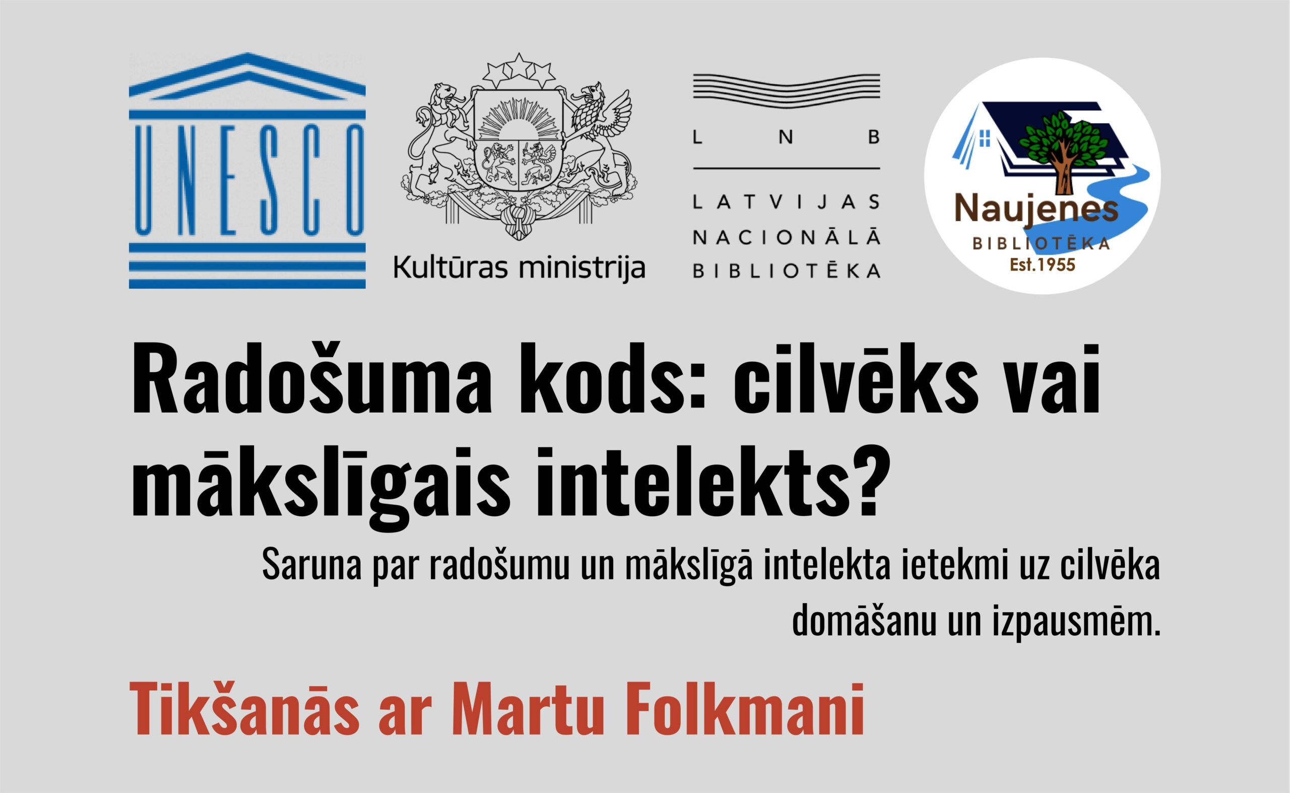 2025. gada 30. oktobrī plkst. 13.30 Naujenes bibliotēkas radošuma aktivitātēm “Radošuma kods: cilvēks vai mākslīgais intelekts?”. Pasākums notiek UNESCO Pasaules medijpratības un informācijpratības nedēļas ietvaros sadarbībā ar ar Latvijas Nacionālās bibliotēkas Bibliotēku attīstības centru un ar LR Kultūras ministrijas finansiālu atbalstu.