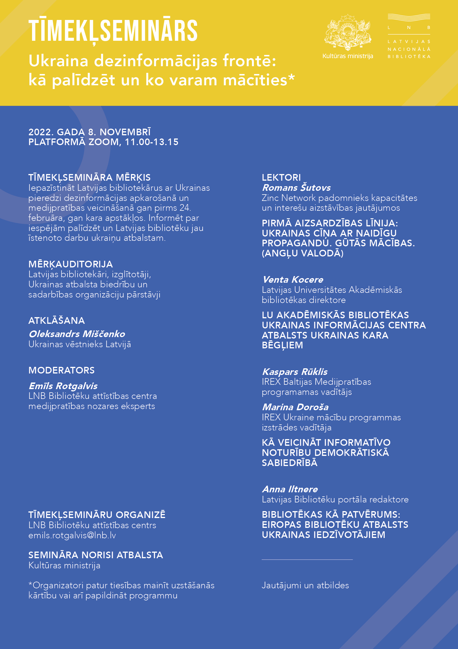 Semināru atklās Ukrainas vēstnieka Latvijā Oleksandra Miščenko uzruna, savukārt sekojošās divas stundas un lektoru prezentācijas būs veltītas diviem jautājumiem – kā Ukraina cīnās ar pret to vērstām dezinformācijas kampaņām un kā gan dezinformācijas apkarošanā, gan ukraiņu tautas atbalstīšanā piedalās bibliotēkas. Seminārā piedalīsies komunikācijas aģentūras “Zinc Network” padomnieks kapacitātes un interešu aizstāvības jautājumos Romans Šutovs no Kijivas, kurš pastāstīs par ukraiņu tautas gūtajām mācībām, cīnoties ar propagandu, kas pret Ukrainu vērsta jau kopš tās neatkarības atgūšanas 1991. gadā. Latvijas Universitātes Akadēmiskās bibliotēkas direktore Venta Kocere iepazīstinās ar bibliotēkas paspārnē mītošo Ukrainas informācijas centru, kas darbojas kopš 2005. gada un pašlaik aktīvi iesaistās Ukrainas kara bēgļu atbalsta pasākumos. Seminārā piedalīsies arī pārstāvji no ASV Starptautiskās pētījumu un apmaiņas padomes (IREX) – Kaspars Rūklis, IREX Baltijas Medijpratības programmas vadītājs un Marina Doroša no IREX Ukraine. Viņi iepazīstinās ar medijpratības kursu “Very Verified”, kas šāgada septembrī iznācis arī latviešu valodā, bet kura pirmsākumi meklējami 2015. gadā Ukrainā. Semināru noslēgs Latvijas Bibliotēku portāla Biblioteka.lv redaktores Annas Iltneres stāstījums par Eiropas bibliotēku atbalstu Ukrainai, kā arī portāla publikācijām.