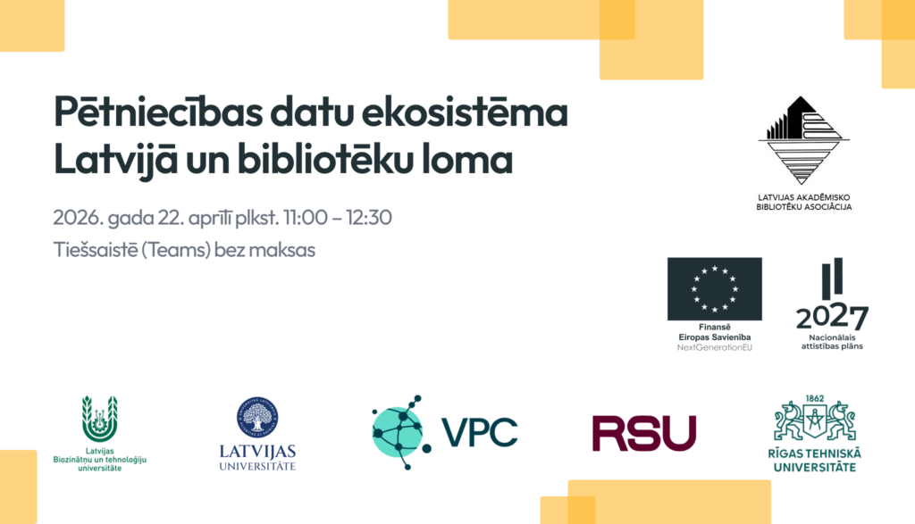Augstākās izglītības un zinātnes IT koplietošanas pakalpojumu centrs (VPC) un Latvijas Akadēmisko bibliotēku asociāciju (LATABA) aicina bibliotēku darbiniekus 2026. gada 22. aprīlī plkst. 11.00 uz tīmekļsemināru par pētniecības datu pārvaldību, atvērto zinātni un bibliotēku speciālistu lomu Latvijas datu ekosistēmā.