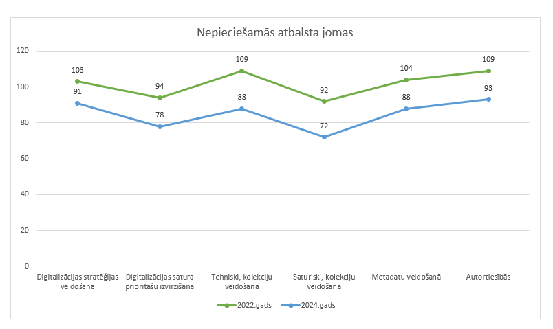 Joprojām pastāv nepieciešamība pēc digitalizācijas mācībām un atbalsta, lai gan vispārējais pieprasījuma līmenis pēc mācībām un rekomendācijām dažādās jomās salīdzinājumā ar 2022. gadu samazinājies (6. att), kas ļauj secināt, ka augusi iekšējā kompetence. Bibliotēkas kā primāro informācijas ieguves formu izvēlas vadlīnijas un instrukcijas, attālinātas tikšanās ar iespēju uzdot jautājumus, kā arī ekspertu konsultācijas. Bibliotēkas norādījušas, ka nepieciešamākie un nozīmīgākie ieteikumi bijuši autortiesību jautājumos, metadatu veidošanā un digitalizācijas stratēģijas veidošanā, par mazāk aktuāliem norādot digitalizācijas prioritāšu noteikšanu un saturisko kolekcijas veidošanu.