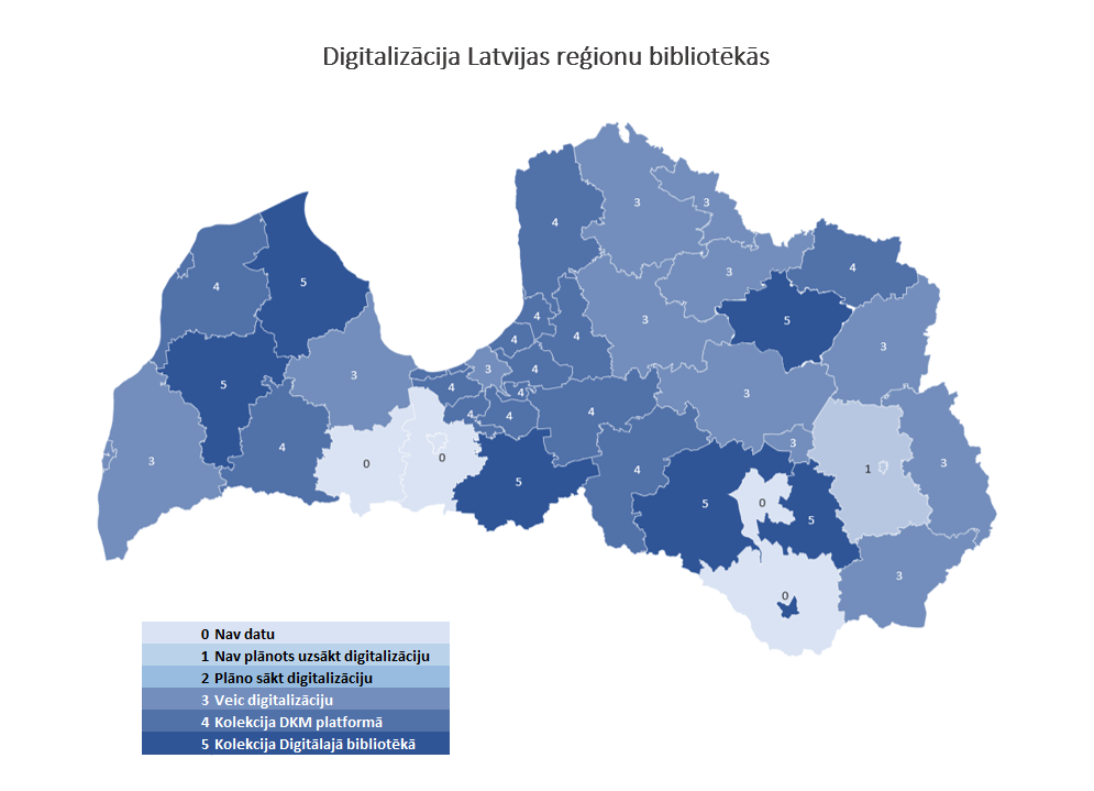 Detalizētākai digitalizācijas izaugsmes izvērtēšanai apkopoti un kombinēti anketās un vienotajā Digitālā kultūras mantojuma (DKM) platformā pieejamie dati, izveidojot karti (2. att), kas sniedz vizuāli strukturētu ieskatu Latvijas bibliotēku digitalizācijas attīstībā, uzsverot gan tās teritorijas, kurās digitālās kolekcijas jau ir pieejamas un tiek strādāts pie digitalizācijas un kompetences pilnveides, gan arī tās, kurās digitalizācijas iniciatīvas vēl nav uzsāktas vai nav plānotas.
