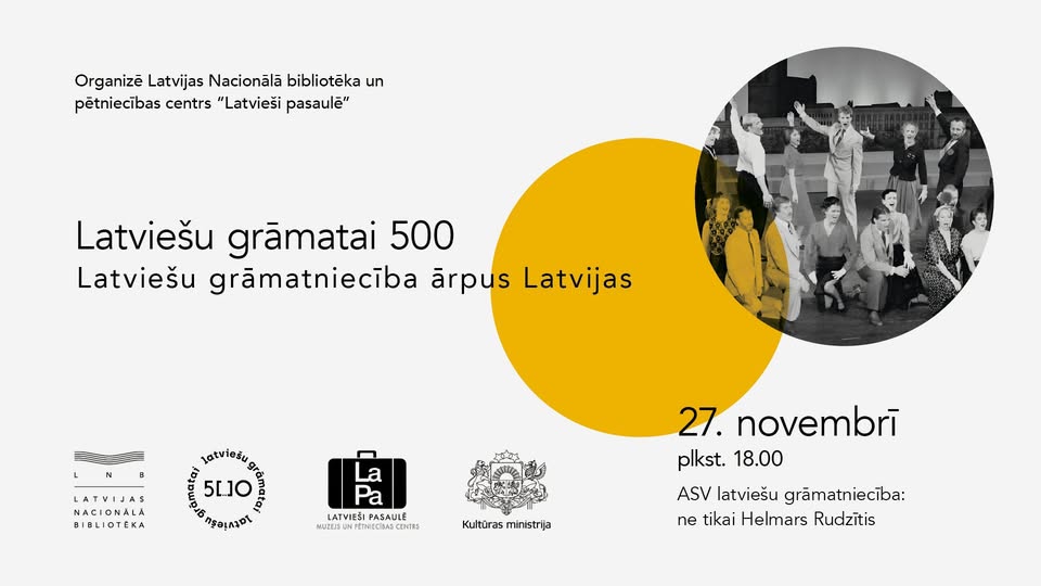 2025. gada 27. novembrī 18.00–19.30 Latvijas Nacionālās bibliotēkas Virtakas klasē (1. stāvā) notiks ceturtā tikšanās ciklā “Latviešu grāmatai 500. Latviešu grāmatniecība ārpus Latvijas”. Uz pasākumu aicināti visi interesenti.