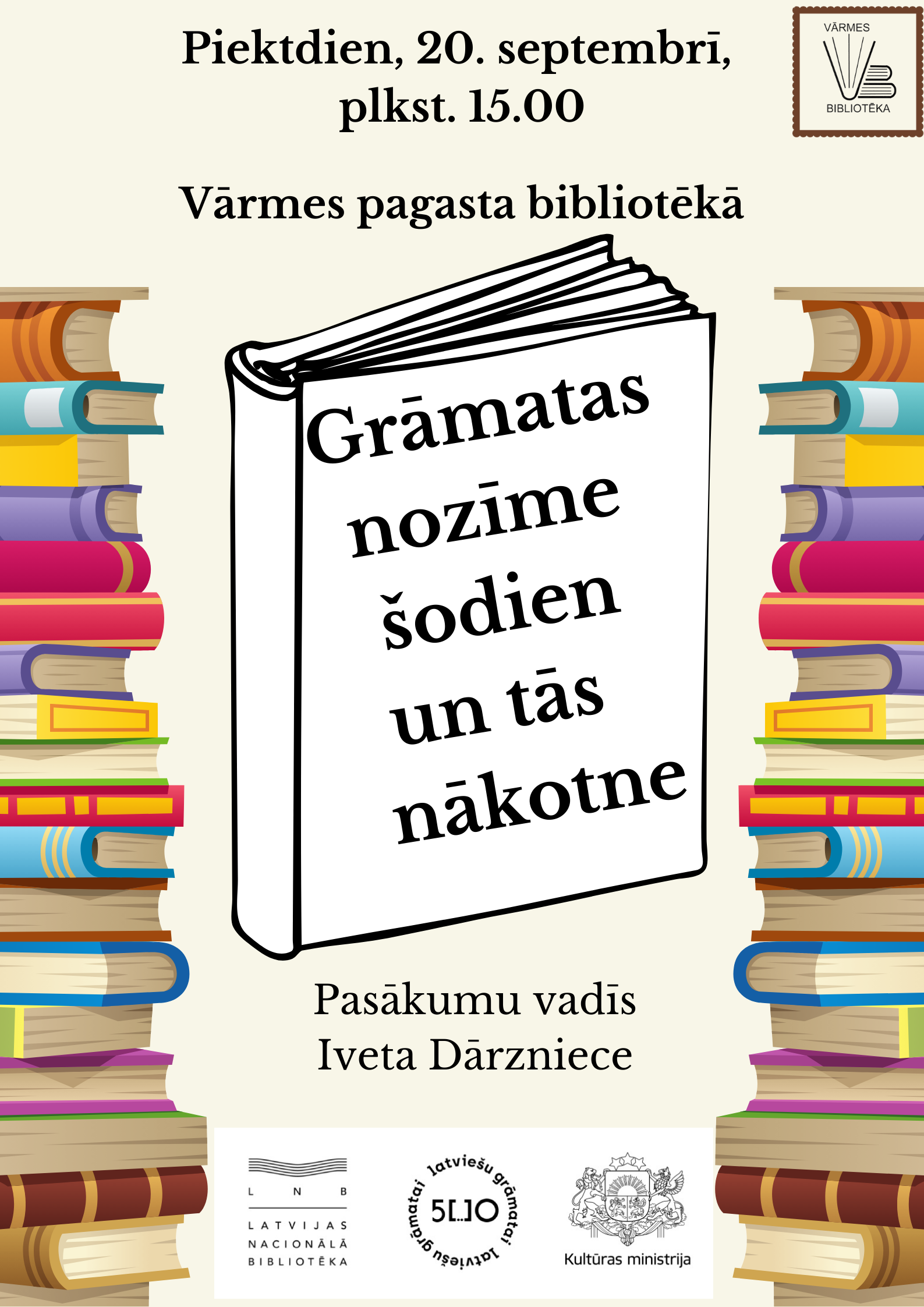 2024. gada 20. septembrī plkst.15.00 Kuldīgas novada Vārmes pagasta bibliotēkā cikla “Latviešu grāmatai 500” ievaros sadarbībā ar Latvijas Nacionālo bibliotēku un ar Latvijas Republikas Kultūras ministrijas finansiālu atbalstu notiks pasākums “Grāmatas nozīme šodien un tās nākotne”.
