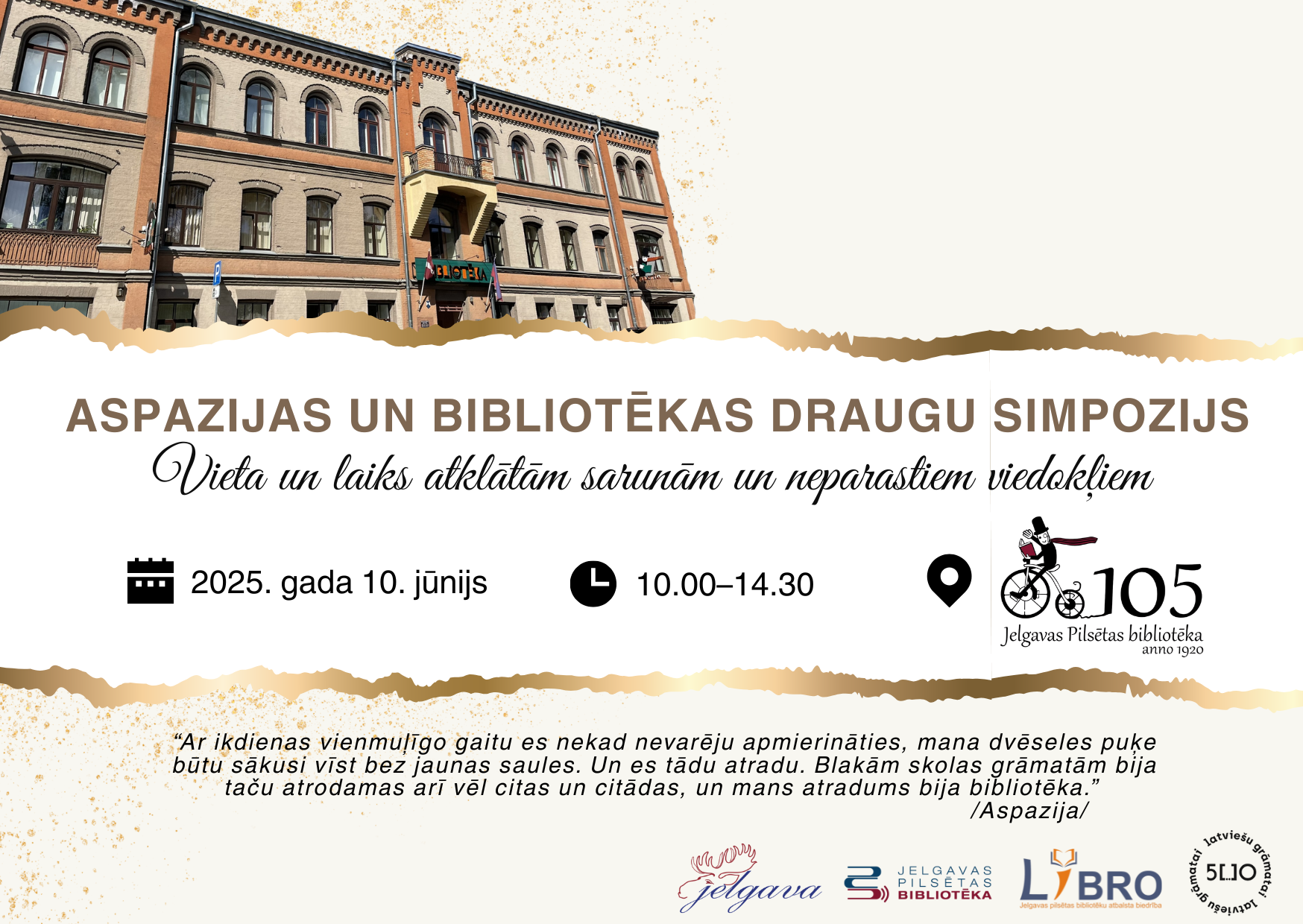 2025. gada 10. jūnijā no pulksten 10.00 līdz 14.30 Jelgavas Pilsētas bibliotēka ielūdz uz “Aspazijas un bibliotēkas draugu simpoziju” – laiku un vietu atklātām sarunām un neparastiem viedokļiem. Simpozijā tiks godināta izcilā novadniece Aspazija viņas 160. jubilejas gadā, kā arī svinēta Jelgavas Pilsētas bibliotēkas 105. dzimšanas diena.