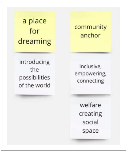 Izpētes un radošo darbnīcu gaitā esmu identificējis piecas vadošās vērtības, kurām, manuprāt, būtu jāatspoguļojas mūsdienu bibliotēku darbībā. Rītdienas biblotēka ir kopienas vajadzībām pielāgota, uz cilvēku centrēta, ar iedvesmojošu, uz radīšanu un sarunām orientētu programmu un dialogā balstītu mācīšanos.