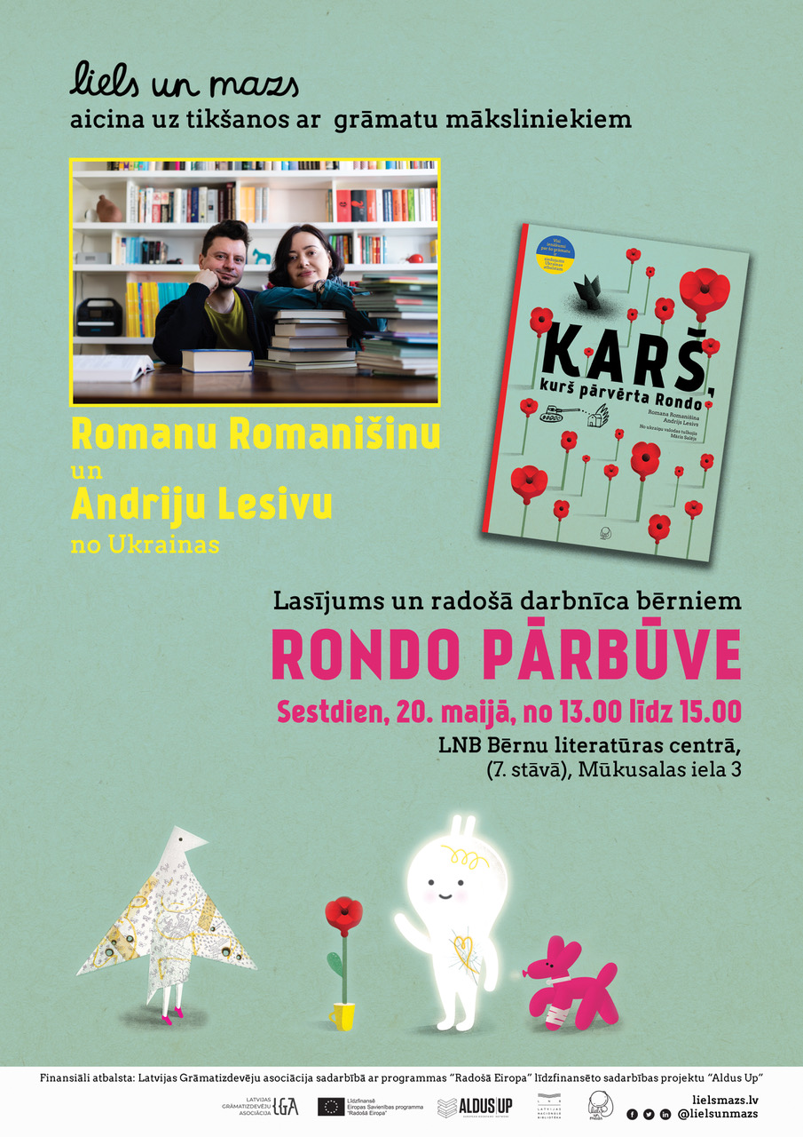Sestdien, 20. maijā, pulksten 13.00, LNB Bērnu literatūras centrā notiks grāmatas “Karš, kurš pārvērta Rondo” lasījums un radošā darbnīca ģimenēm ar bērniem “Rondo pārbūve”. Pēc kopēja lasījuma un sarunas par grāmatu, mākslinieku vadībā bērni radīs lielo pilsētiņas Rondo pārbūves un atjaunošanas plānu. Uz pasākumu laipni aicinātas arī Latvijā pašlaik dzīvojošās ukraiņu ģimenes. Ieeja pasākumā bez maksas.
