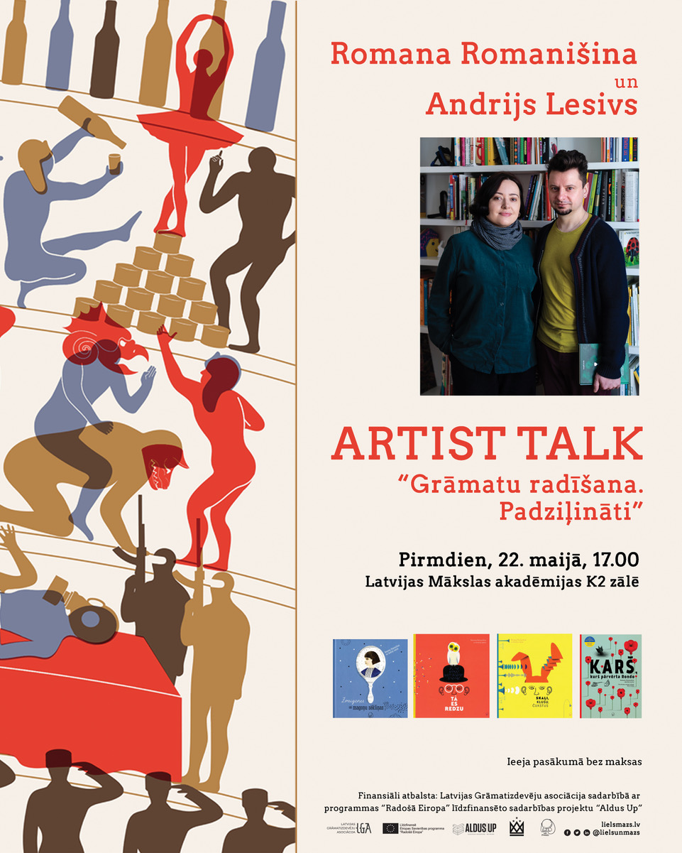 Pirmdien, 22. maijā, pulksten 17.00, Latvijas Mākslas akadēmijas jaunajā korpusā (K2) visi interesenti būs gaidīti uz mākslinieku darbu prezentāciju “Grāmatu radīšana. Padziļināti”, kurā Romana Romanišina un Andrijs Lesivs stāstīs par savu darbu tapšanu. Uz šo pasākumu īpaši aicināti mākslas studenti un ilustrācijas un dizaina nozares profesionāļi, kā arī visi vizuālajā mākslā un grāmatniecības nozares novitātēs ieinteresētie. Ieeja pasākumā bez maksas.