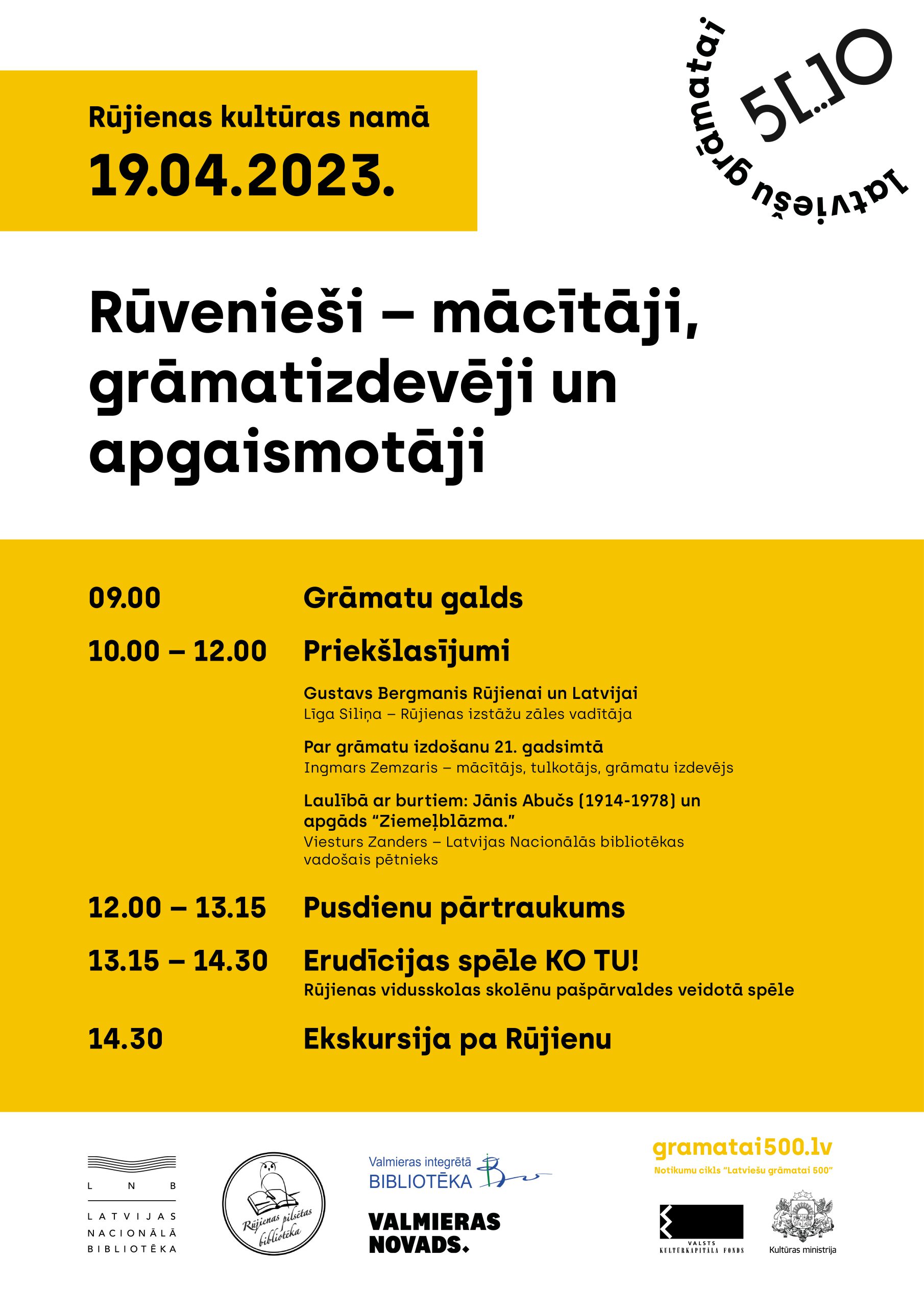Latvijas Nacionālā bibliotēka sadarbībā ar reģionu bibliotēkām 2023. gada 1. martā uzsāka īstenot Valsts Kultūrkapitāla fonda atbalstītu projektu “Ceļā uz “Latviešu grāmatai 500″ Latvijas reģionos: izdevējdarbība un tekstu izplatība senāk un tagad”, iekļaujoties 2023. gada notikuma cikla “Latviešu grāmatai 500” tēmā – grāmatu un ideju izplatīšana un izdošana, īpaši izceļot latviešu izdevēja Anša Gulbja 150. gadadienu. Projekta mērķis ir izgaismot grāmatniecības procesus un notikumus Latvijas reģionos. Laika posmā no 2023. gada aprīļa līdz decembrim Latvijas Nacionālā bibliotēka sadarbībā ar Jelgavas, Valmieras, Bauskas, Valkas, Liepājas, Limbažu un Daugavpils reģiona galvenajām bibliotēkām organizēs plašu pasākumu programmu ar daudzveidīgām norisēm. Pasākums Rūjienā “Rūvēnieši – mācītāji, grāmatzidevēji un apgaismotāji” ir pirmais no programmas notikumiem. Vairāk par projektu un plānotajiem pasākumiem.