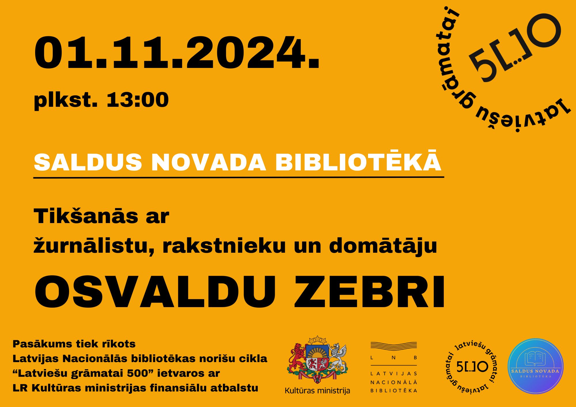 Saldus bibliotēka sadarbībā ar Latvijas Nacionālo bibliotēku (LNB) un Saldus novada izglītības iestādēm LNB norišu cikla “Latviešu grāmatai 500” ietvaros aicina Saldus novada jauniešus uz īpašu tikšanos ar rakstnieku, žurnālistu un domātāju Osvaldu Zebri. Pasākums notiks 2024. gada 1. novembrī plkst. 13.00 Saldus novada bibliotēkas Konferenču zālē, kur jauniešiem būs iespēja dzirdēt aizraujošu stāstījumu par radošo procesu, literatūru un valodu, kā arī piedalīties diskusijā par mūsdienu aktuālajiem sabiedrības un kultūras jautājumiem.