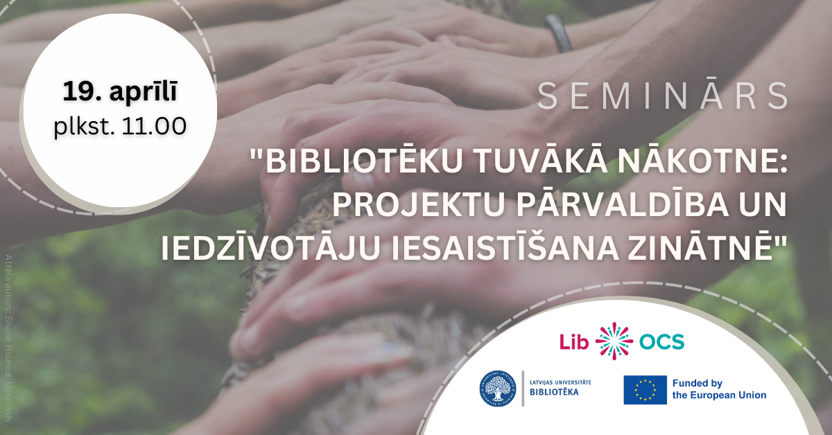 LU Bibliotēka aicina Latvijas bibliotēku jomas saimi uz semināru “Bibliotēku tuvākā nākotne: projektu pārvaldība un iedzīvotāju iesaistīšana zinātnē” 2023. gada 19. aprīlī plkst. 11.00 LU Zinātņu mājā, Jelgavas ielā 3.