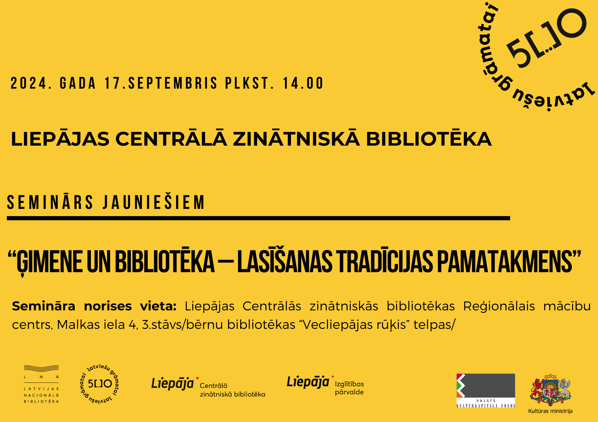 Liepājas Centrālā zinātniskā bibliotēka (LCZB) ir iesaistījusies Latvijas Nacionālās bibliotēkas īstenotā pasākumu ciklā – “Latviešu grāmatai 500”, piedāvājot katru gadu, līdz 2025. gadam, akcentēt kādu būtisku notikuma aspektu. 2024. gada 17. septembrī plkst. 14.00 Liepājas Centrālās zinātniskās bibliotēkas Reģionālajā mācību centrā notiks seminārs jauniešiem “Ģimene un bibliotēka – lasīšanas tradīcijas pamatakmens”.