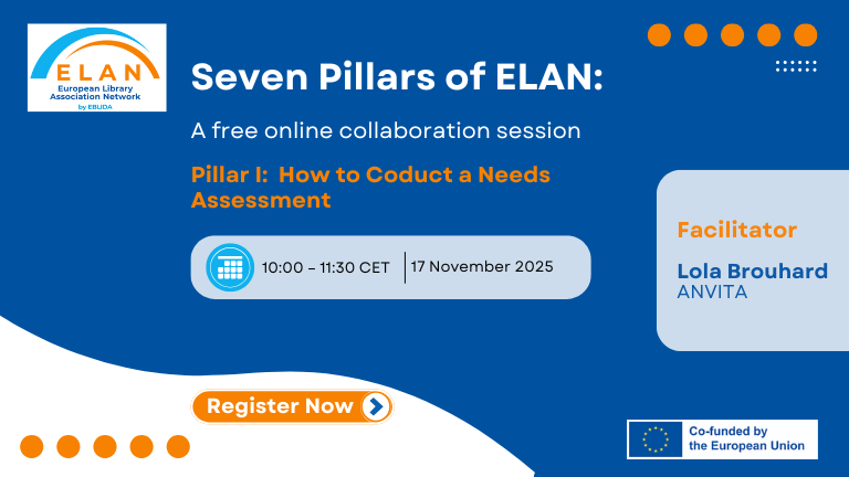 Eiropas Bibliotēku, informācijas un dokumentācijas asociāciju birojs (EBLIDA) paziņo jauno datumu pirmajai ELAN sadarbības sesijai, kas veltīta tematam “Kā veikt vajadzību izvērtējumu”. Pasākums notiks 2025. gada 17. novembrī plkst. 10.00–11.30 (CET) tiešsaistē.