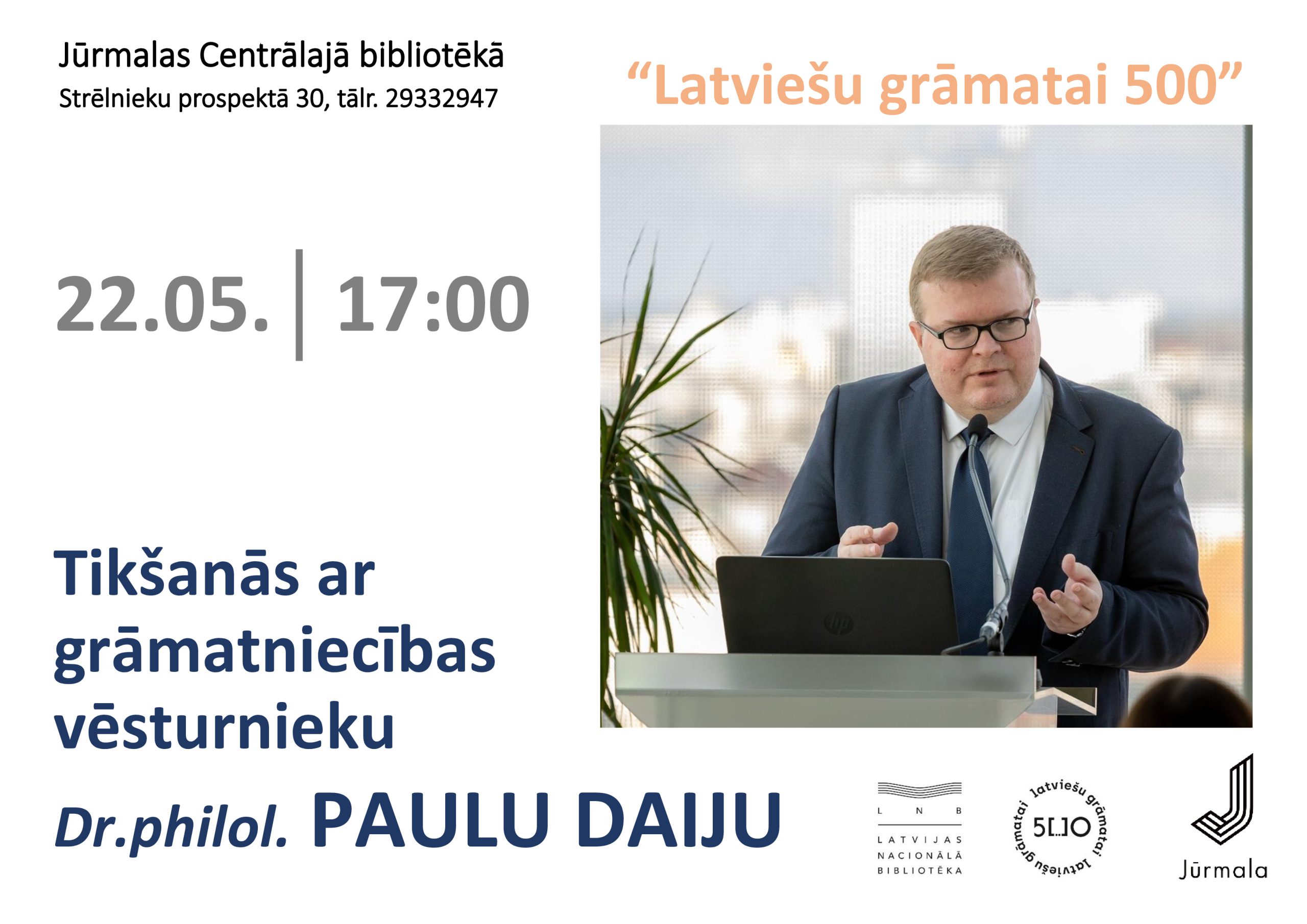 Latvijas Nacionālās bibliotēkas pētniecības vadītājs, grāmatniecības vēsturnieks Dr. phil. Pauls Daija pavērs ieskatu šī zinātniskā darba aizkulisēs, dalīsies jaunatrastos materiālos, kā arī stāstīs par programmu “Latviešu grāmatai 500” un tās aktualitātēm šogad.