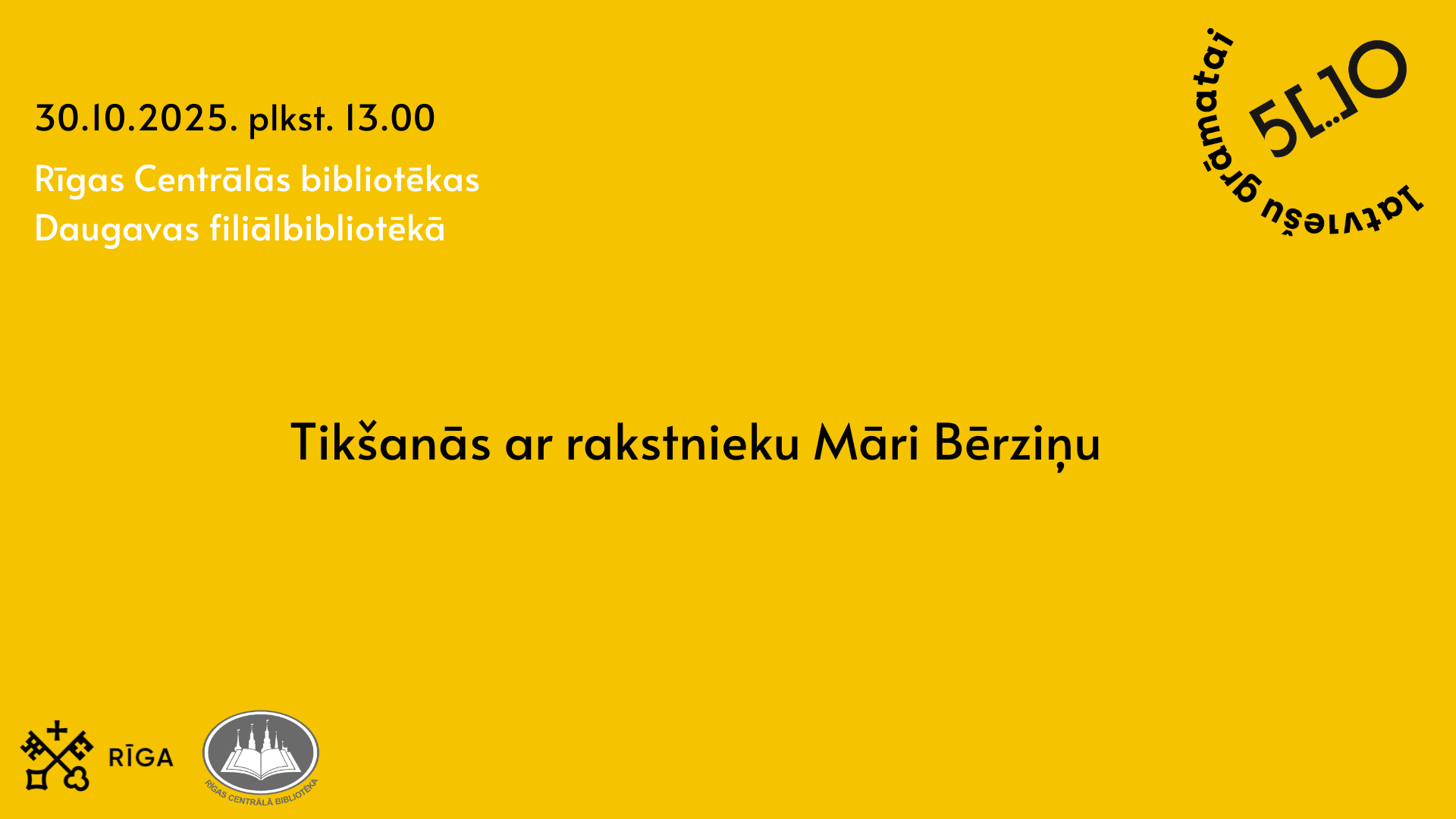 2025. gada 30. oktobrī plkst. 13.00 Rīgas Centrālās bibliotēkas Daugavas filiālbibliotēkā (Vizlas ielā 1) notiks tikšanās ar rakstnieku Māri Bērziņu.