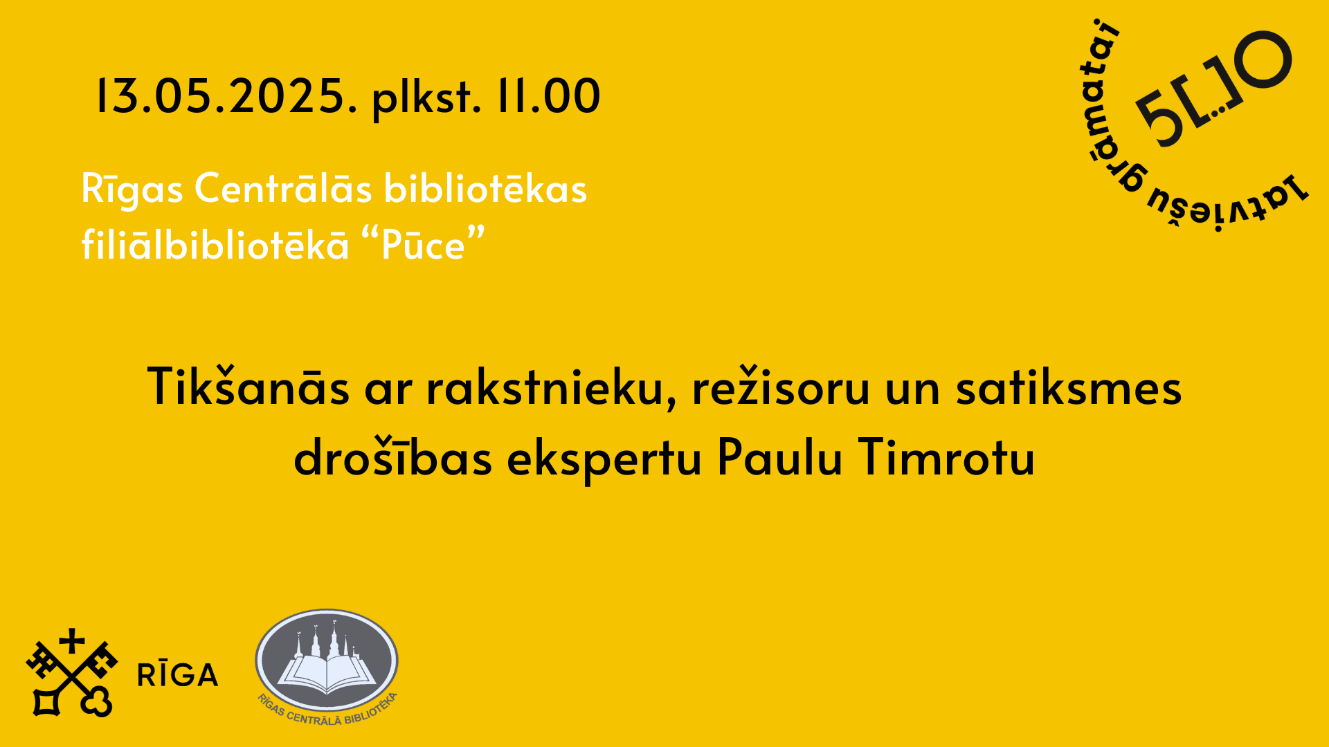 13. maijā plkst. 11.00 Rīgas Centrālās bibliotēkas filiālbibliotēkā “Pūce” (Andreja Saharova iela 35) notiks tikšanās ar režisoru, grāmatu autoru un satiksmes drošības ekspertu Paulu Timrotu.