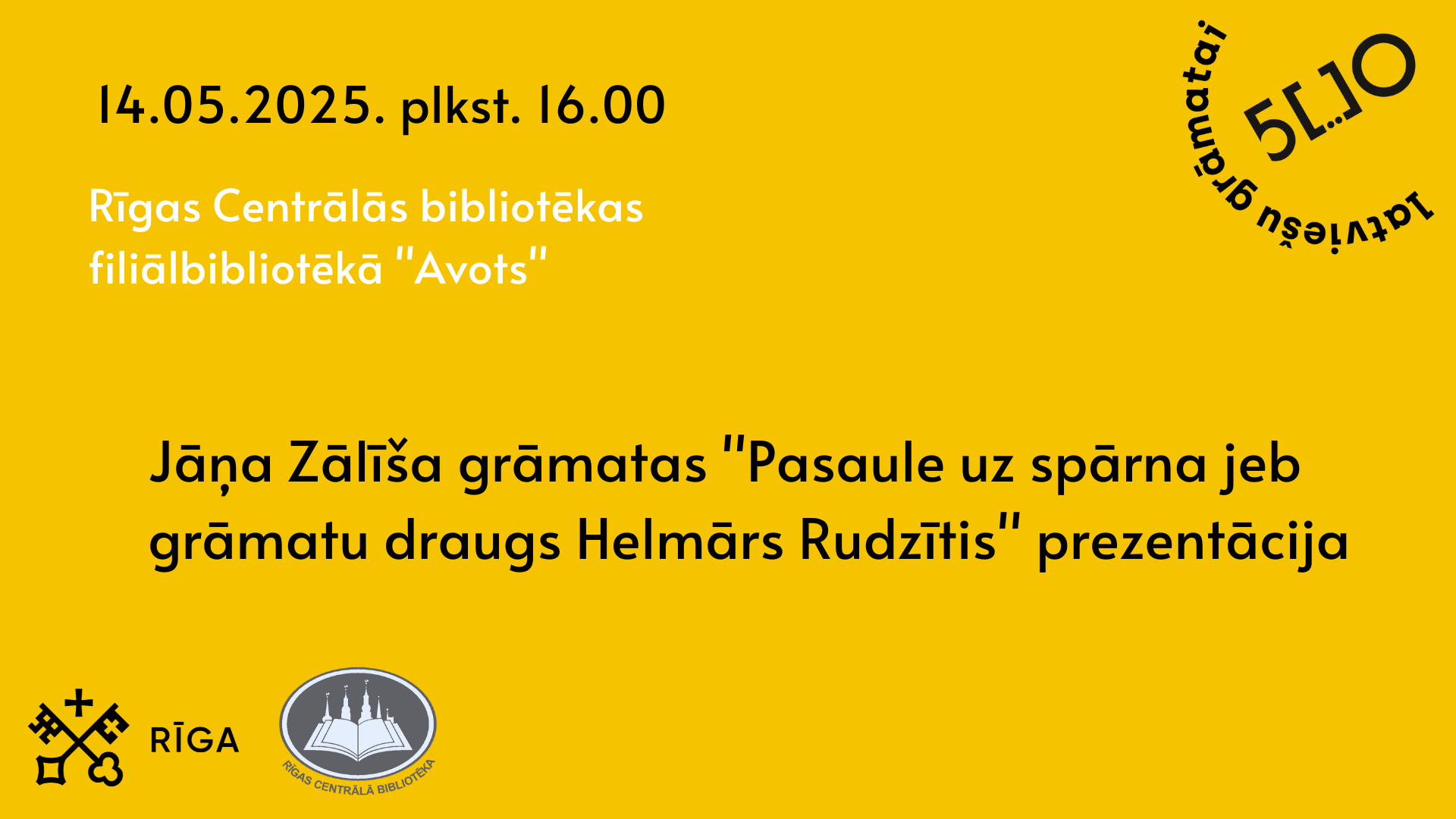 14. maijā plkst. 16.00 Rīgas Centrālās bibliotēkas filiālbibliotēkā “Avots” (Stabu iela 64 k-3) notiks Jāņa Zālīša grāmatas “Pasaule uz spārna jeb grāmatu draugs Helmārs Rudzītis” prezentācija.