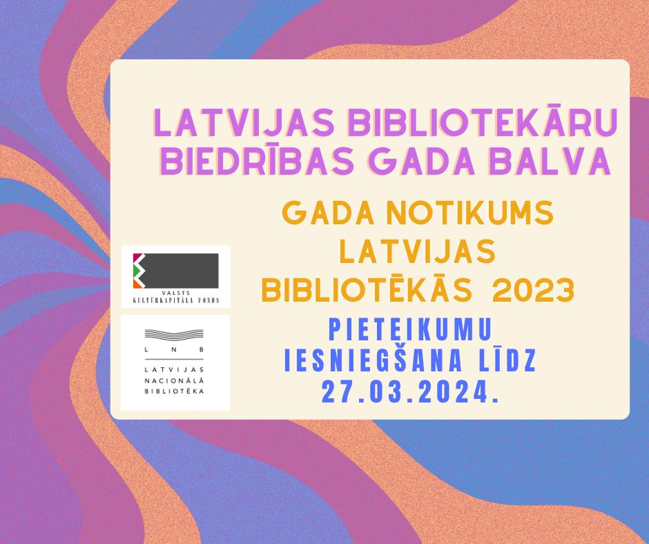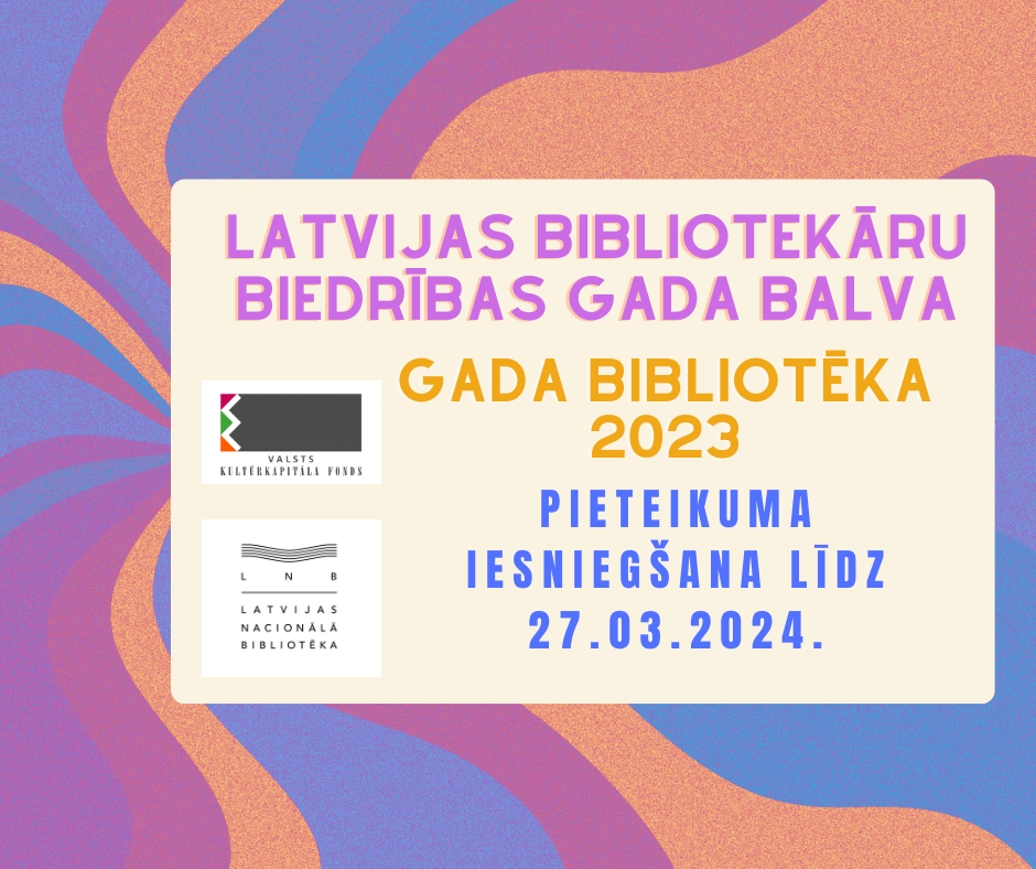 Latvijas Bibliotekāru biedrība (LBB) aicina pieteikties uz LBB Gada balvu divās kategorijās: LBB Gada bibliotekārs 2023 un LBB Gada bibliotēka 2023, kā arī pieņem pieteikumus nominācijā “Gada notikums Latvijas bibliotēkās 2023”. Pieteikumu iesniegšanas termiņš ir 2024. gada 27. marts.